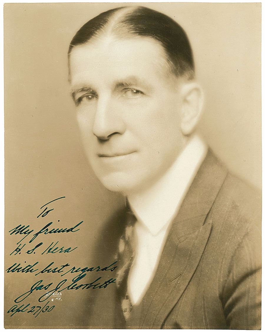 Vintage sepia glossy 7.25 x 9 Apeda Studios portrait of Corbett in a suit and tie, attractively signed and inscribed in fountain pen, “To my friend H. S. Hera, with best regards, Jas. J. Corbett, Apr. 27/30.” In fine condition, with trimmed edges, and some scattered creases, primarily to the top. Apeda became the primary metropolitan photography studio of boxers and baseball players, as well as a publicity manufacturer for Broadway performers. An ideal portrait of the former heavyweight king.