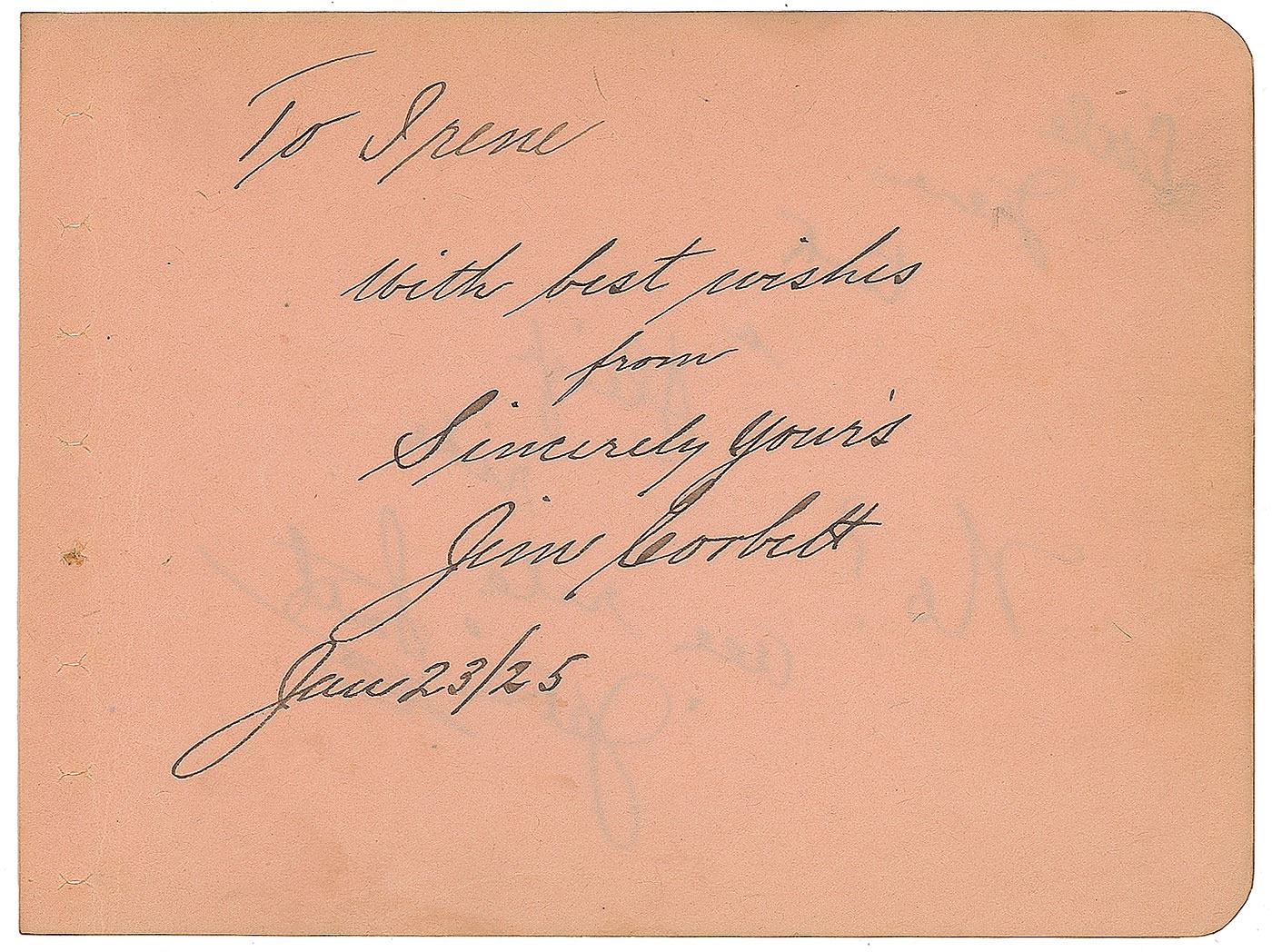 Vintage fountain pen signature and inscription, "To Irene, with best wishes from, Sincerely your's, Jim Corbett, Jan 23/25,” on a beige 5.5 x 4.25 album page. In fine condition.