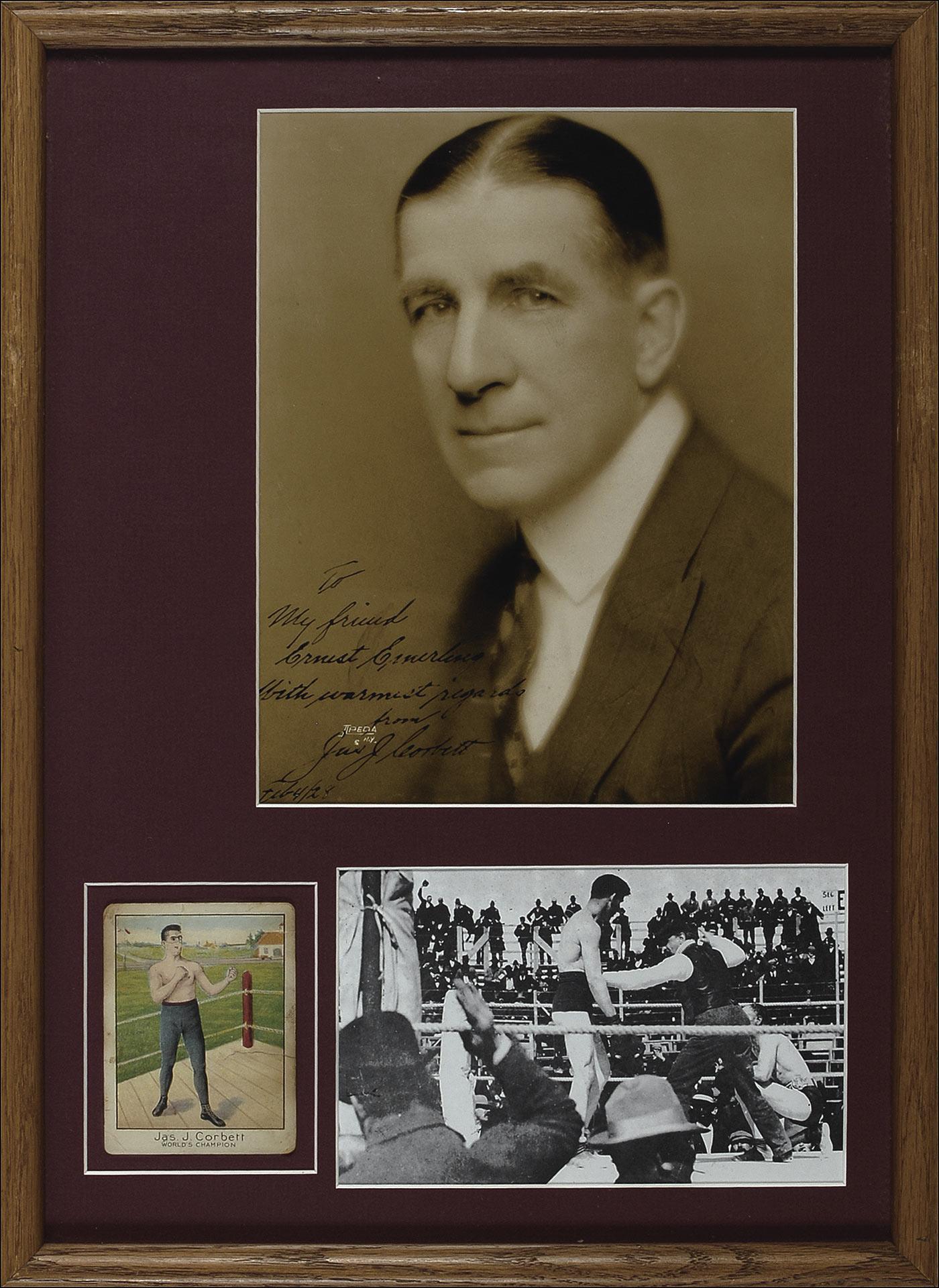 Vintage pearl-finish 7 x 9 photo of Corbett looking gentlemanly in a suit and tie, signed and inscribed in fountain pen “To my friend Ernest Emerlins, with warmest regards from Jas. J. Corbett Feb 4/28.” Matted and framed with a photo of Corbett in the ring with Bob Fitzsimmons, and a cigarette card of Corbett, to an overall size of 12.25 x 17. In fine condition, with some scattered light creasing and a few areas of emulsion irregularity at bottom edge.