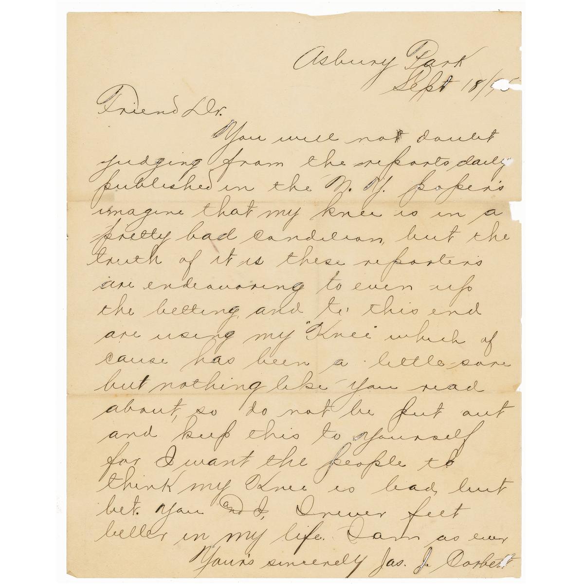 ALS signed “Jas J. Corbett,” one onionskin page, 8 x 10, September 18, 1895. Corbett writes “Friend Dr.” and mentions an injury prior to his ultimately delayed fight versus Bob Fitzsimmons. In part: “You will no doubt judging from the reports daily published in the N.Y. papers imagine that my knee is…pretty bad…but the truth of it is these reporters are endeavoring to even info the belting and to this end are using my ‘knee’ which of cause [sic] has been a little sore but nothing like you read about, so do not be put out and keep this to yourself for I want the people to think my knee is bad, but bet. you and I, I never felt better in my life.” In very good condition, with missing paper along the right edge, small tears along some of the intersecting folds, spots of paper loss from ink erosion, including to the date and Corbett’s middle initial.