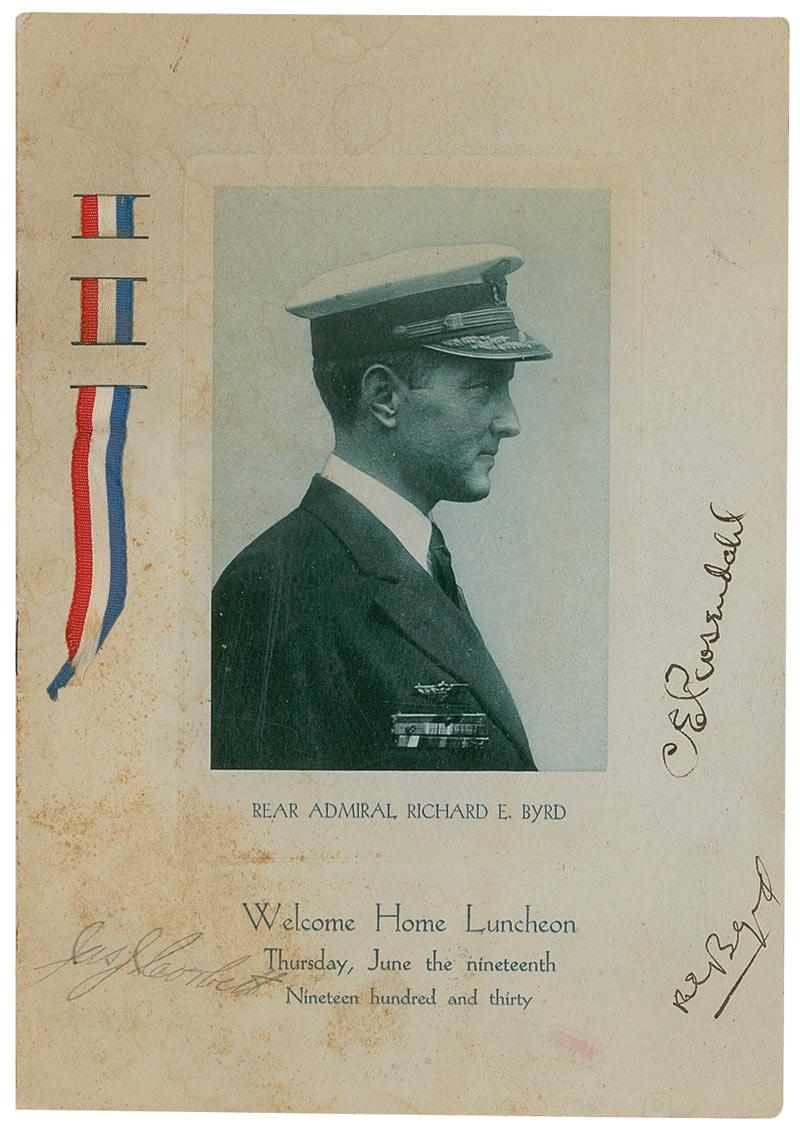 Menu, 6.5 x 9.5 for the Welcome Home Luncheon honoring Admiral Richard Byrd, given by the Advertising Club of New York on June 19, 1930, on the occassion of his return from the South Pole. Signed on the front cover in black ink, “Jas. J. Corbett,” and also signed, “R. E. Byrd” and “C. E. Rosendahl.” In very good condition, with scattered toning and foxing to covers, lightly affecting Corbett’s signature, some small damps stains, and mild handling wear. The menu retains its red, white, and blue ribbon. The New York Times reported on June 20, 1939, “Rear Admiral Richard E. Byrd and a group of his comrades of the Antarctic expedition were honored yesterday at a luncheon given by the Advertising Club of New York…More than 300 members of the club packed the room and cheered when Byrd was lauded, and applauded again and again when he gave the credit for the expedition to his comrades and his backers.”