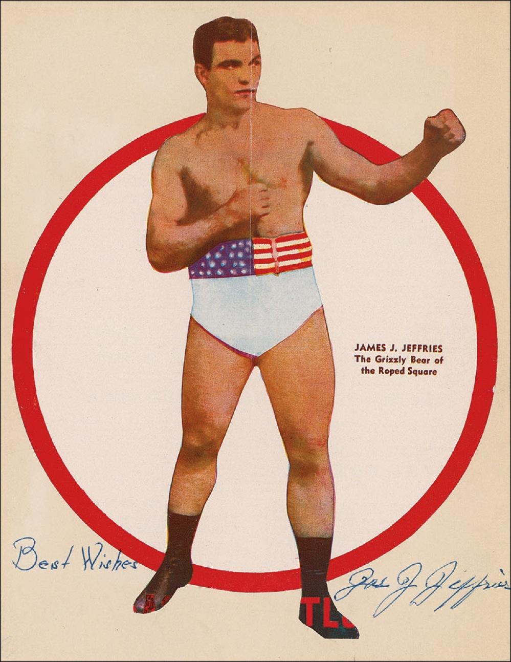 James J. Jeffries color magazine photo in his prime signed in blue ballpoint, “Best wishes, Jas. J. Jeffries.” Trimmed and affixed to a 7.5'' x 10'' off-white card. In fine condition, with a light central vertical fold and light toning. Colors still very bright and vibrant.