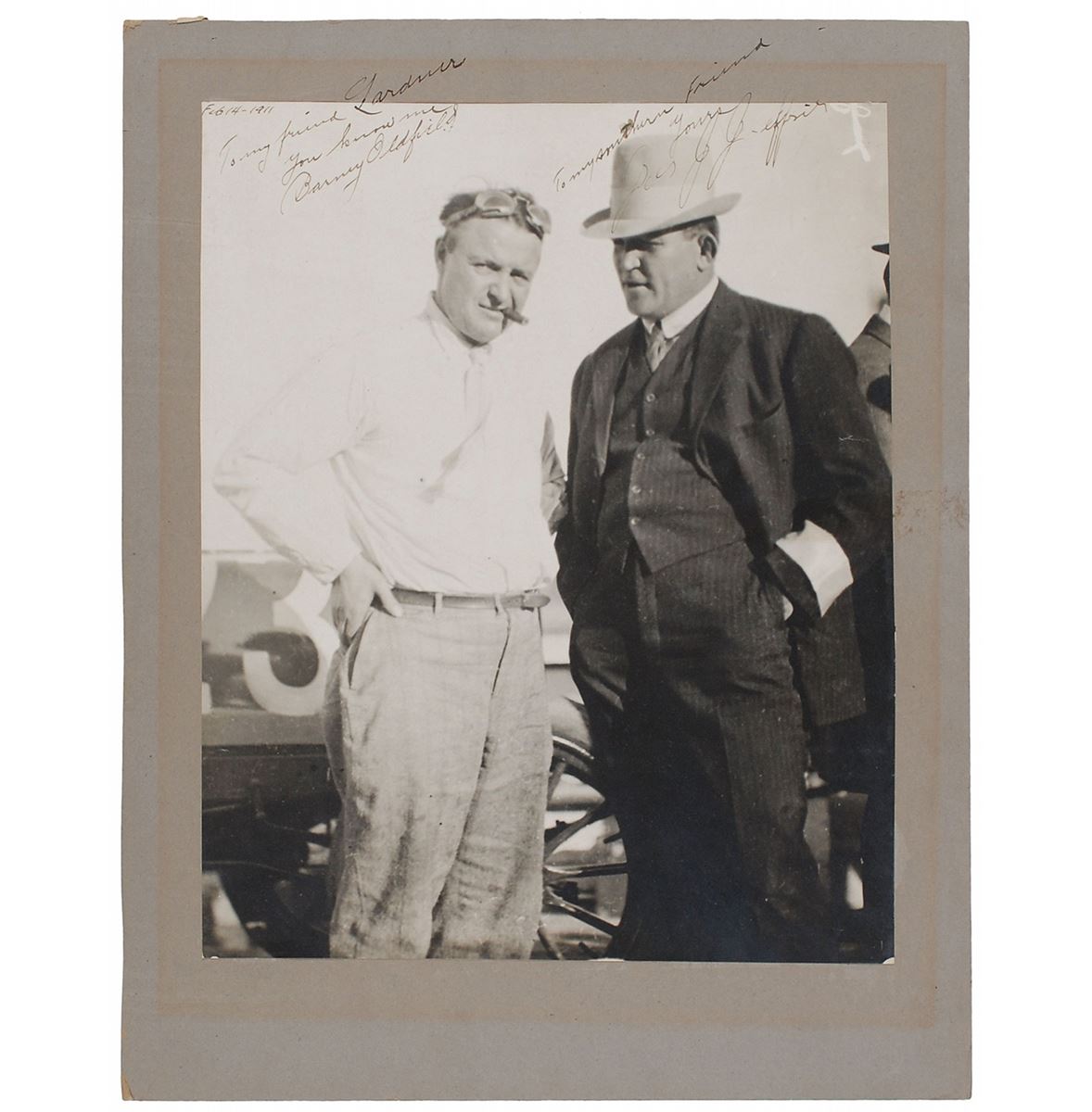 Unique semi-glossy 9.25 x 12 photo of the heavyweight boxer and auto racing pioneer together in front of an automobile, affixed to a 12 x 15.25 mount, signed and inscribed at the top in fountain pen to famed sportswriter Ring Lardner, “To my friend Lardner, You know me, Barry Oldfield” and, “To my southern friend, Yours, Jas. J. Jeffries.” A date notation of February 4, 1911, is penned in the upper left corner. In very good condition, with an overall block of toning from previous display, an area of soiling to the right side of the mount, trimmed mount edges, and scattered surface marks and rubbing. Oldfield and Jeffries were good friends, and both had recently squared off against the great Jack Johnson in their respective sports—Jeffries was famously dealt his only loss in the ring by Johnson seven months earlier in July, while Oldfield had beaten Johnson in two auto races after being challenged by him in October. The pair had also made the papers six weeks earlier when they were thrown from a car while speeding down a road at forty miles per hour. An excellent association piece between sporting giants of the early 20th century.