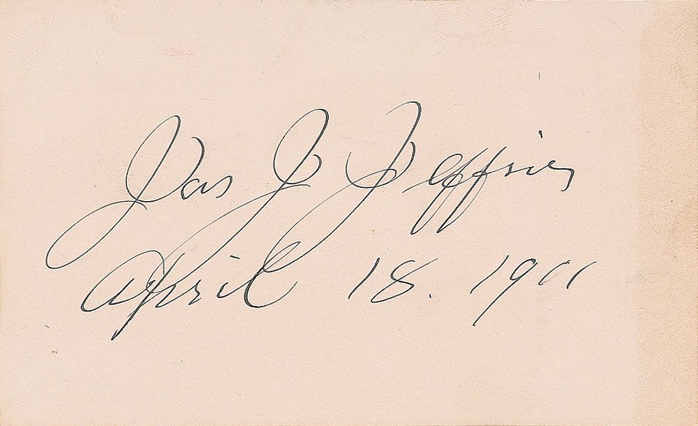 Vintage ink signature, “Jas. J. Jeffries, April 18, 1911,” on an off-white 4.5 x 2.75 card. In fine condition, with a few mild bends, light band of toning to the right border, and mounting remnants to reverse from previous display in a scrapbook.