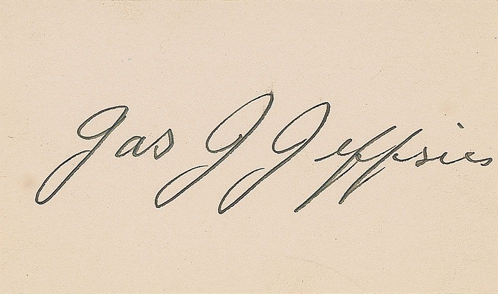 Nice vintage fountain pen signature, “Jas. J. Jeffries,” on an off-white 3.5 x 2 card. In fine condition.