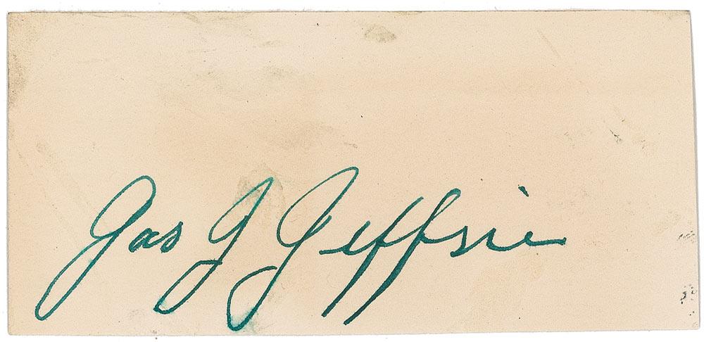 Legendary American boxer (1875–1953) who was heavyweight champion of the world from 1899 to 1904. Vintage ink signature, “Jas. J. Jeffries,” on an off-white 4 x 2 card. Some mild toning and soiling, a couple trivial areas of ink spreading to signature, and mounting remnants on reverse, otherwise fine condition. Pre-certified Steve Grad/PSA/DNA and RRAuction COA.