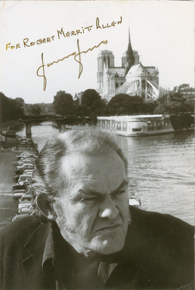 Glossy 4.5 x 7 photo of Jones at the River Seine, signed and inscribed in black ink “For Robert Merritt Allen, James Jones.” In very good condition, with some scattered light bends and creases and some light haloing to signature and inscription.