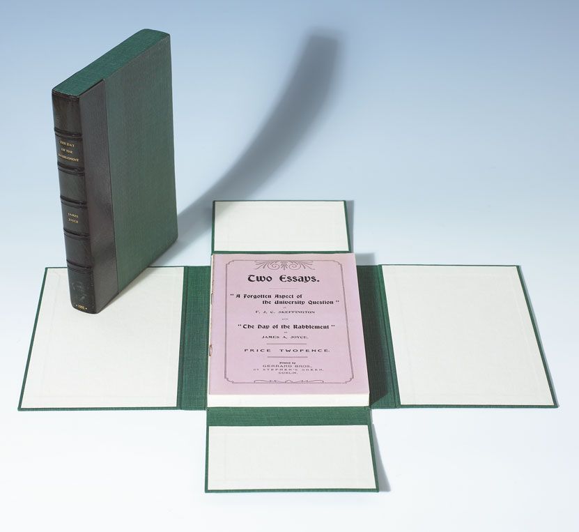 Joyce’s first published essay and only the second of any of his published works. A critique of the overt nationalism and perceived provincialism of the Irish Literary Theatre, Joyce’s essay was originally commissioned by the editor of St Stephen’s magazine, but subsequently rejected by the censor on account of its mentioning a novel by Gabriel D’annunzio, Il Fuco (1900), which was banned by the Vatican.Privately published by Joyce and F. J. C. Skeffington, whose similarly censored essay on women’s education, ‘A Forgotten Aspect of the University Question’, is also contained herein. Joyce and Skeffington arranged for their essays to be printed together in pamphlet form by Gerrard Bros. The exact quantity printed is unknown. Skeffington’s son believed it to be in the region of 100 to 200, but in A Catalogue of Rare Books published in 1933 by the Ulysses Bookshop, New York, it was stated definitely that only 85 copies were printed. Handsomely presented in a green cloth folding box with matching slipcase of half calf, lettered in gilt and with raised bands. Handsomely presented in a green cloth folding box with matching slipcase of half calf, lettered in gilt and with raised bands.