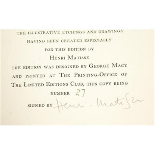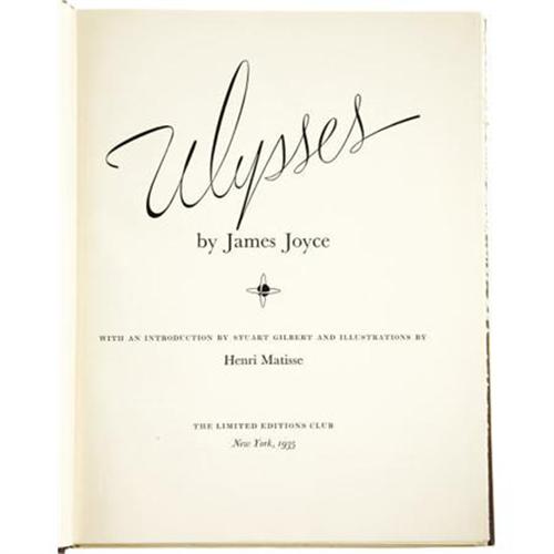 <B>James Joyce: <I>Ulysses</B></I></B></I> <B>Signed by the Illustrator, Henri Matisse</B></I> (New York: The Limited Editions Club, 1935), first edition thus, 363 pages plus limitation page, brown cloth with gilt titles and decorative stamping on the spine and front board, 4to (9.25" x 11.75"), housed in an original issue slipcase with brown titles on the spine. Deckled edges. Number 27 of 1,500 made for the Limited Editions Club and signed "<I>Henri Matisse</B></I>" on the limitation page bound in the rear. Illustrations are reproductions of black and white Matisse chalk drawings on yellow, blue, and white paper. The book is in fine condition, though the slipcase shows wear along the spine.<BR><BR><b>Shipping:</b> Books & Catalogs (<a target="_blank" href="http://www.heritageauctions.com/common/shipping.php">view shipping information</a>)