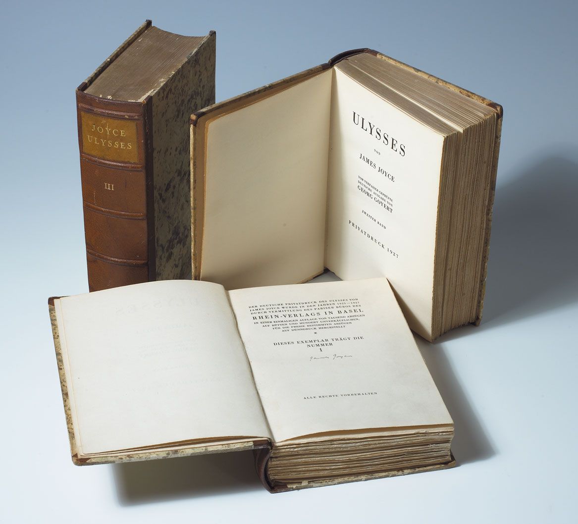 Basel: Rhein-Verlag, 1927, original half morocco over patterned paper boards.Rhein-Verlag, Basel, 1927. The first edition in German, limited to 1,100 copies, of which the first 100 were signed by Joyce. This is number 1 of the 100 signed copies. The German edition was the first translation of Ulysses to be published. Rhein-Verlag held a competition to find a translator, finally selecting Georg Goyert, who subsequently worked with Joyce on the translation in Ostend during the summer of 1926. Joyce was pleased with the edition and the publication was a success, selling out in three weeks. Issued in three volumes, each octavo in quarter brown morocco over marbled boards; raised bands at spine with green calf gilt lettering labels; red cloth page markers; top edges gilt, some gatherings still uncut. Edges a little rubbed, corners bumped, upper hinge of Vol. I partially split, but an excellent set overall, and extremely rare with Joyce’s signature.