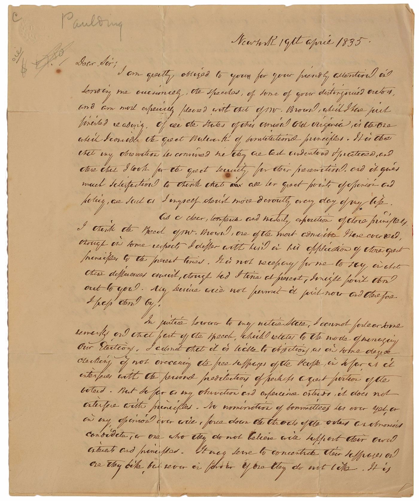 American writer and United States Secretary of the Navy (1778–1860); as a member of the 'Knickerbocker Group,' he co-wrote the satirical periodical Salmagundi with Washington Irving, an issue of which, from November 11, 1807, first attached the name 'Gotham' to New York City. ALS signed “J. K. Paulding,” four pages on two sheets, 7.25 x 9, April 19, 1835. Letter to Thomas W. White, in part: "Of all the states of the Union, Old Virginia, is the one which I consider the great network of constitutional principles. It is there that my observation has convinced me they are best understood & protected, and there that I look for the great security for their preservation, and it gives much satisfaction to think that all her great points of opinion and policy, as such as I myself think more devoutly every day." Addressed on the reverse of the second page in Paulding's own hand. In very good to fine condition, with splitting along intersecting folds (some repaired with old clear tape), and seal-related paper loss to the second page.