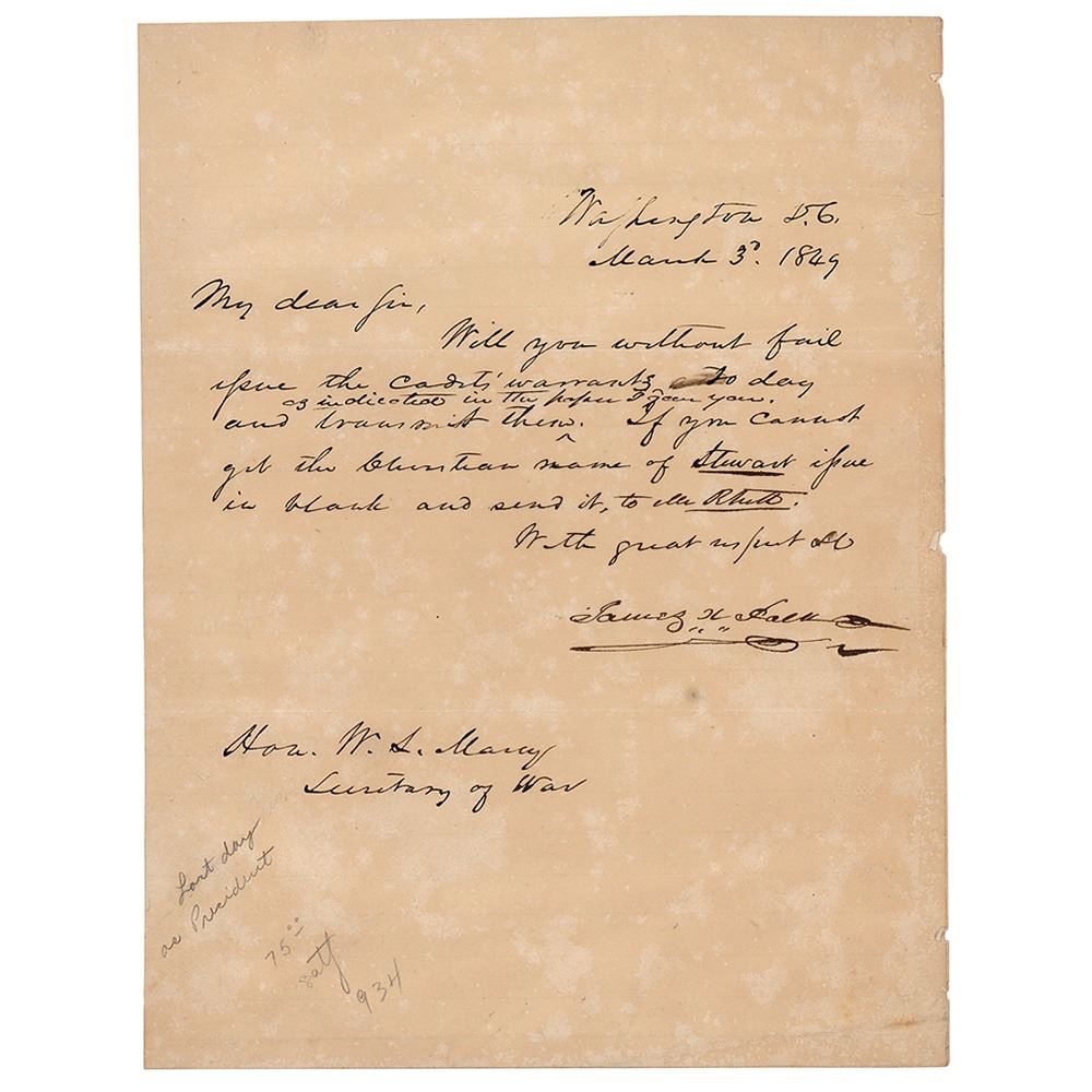 ALS as president, one page, 7.5 x 10, March 3, 1849. Addressed from Washington, a handwritten letter from James K. Polk sent to his Secretary of War, William L. Marcy, in full: “Will you without fail issue the cadets’ warrants today and transmit them as indicated in the paper I gave you. If you cannot get the Christian name of Stewart issue it blank and send it, to Mr. Rhett.†In very good to fine condition, with overall wrinkling, rippling, and slightly irregular toning. An appealing piece of correspondence from the president to a cabinet member, penned by Polk on the last full day of his presidency.