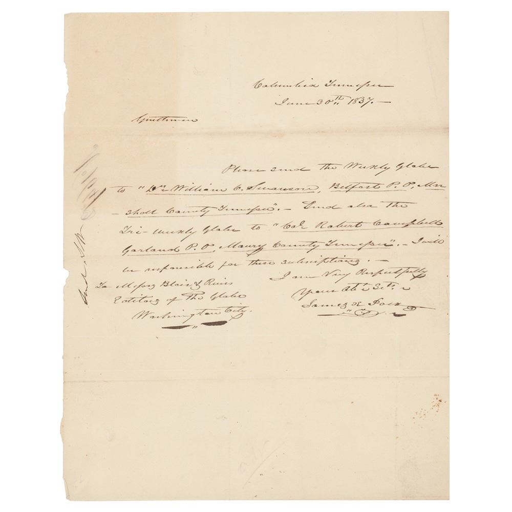 ALS as Speaker of the House, one page, 7.75 x 9.75, June 30, 1837. Sent from Columbia, Tennessee, a handwritten letter to Francis Preston Blair and John C. Rives, the editors of the Washington Globe, the primary propaganda instrument for the Democratic Party. In full: "Please send the Weekly Globe to 'Dr. William C. Swanson, Belfast P. P. Marshall County Tennessee.' Send also the Tri-weekly Globe to 'Col. Robert Campbell Garland P. O., Maury County Tennessee.' I will be responsible for these subscriptions." In fine condition, with a faint block of toning to the upper left corner area.