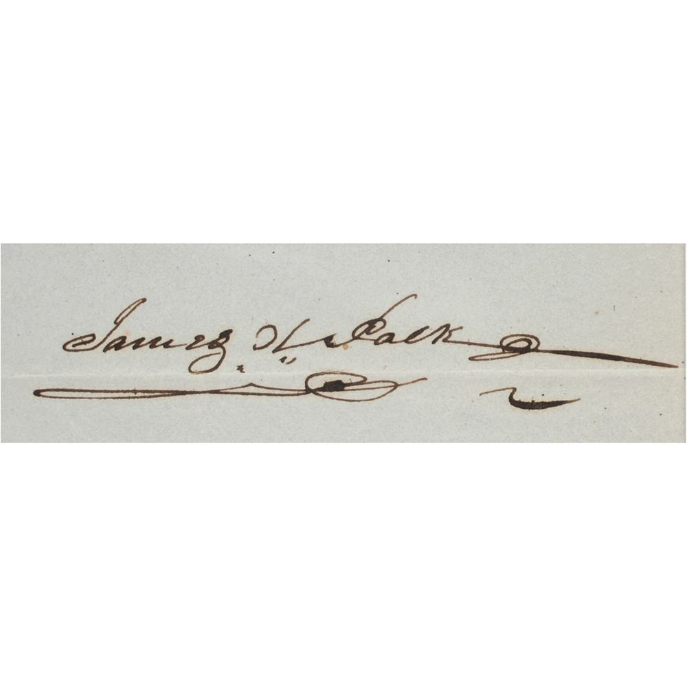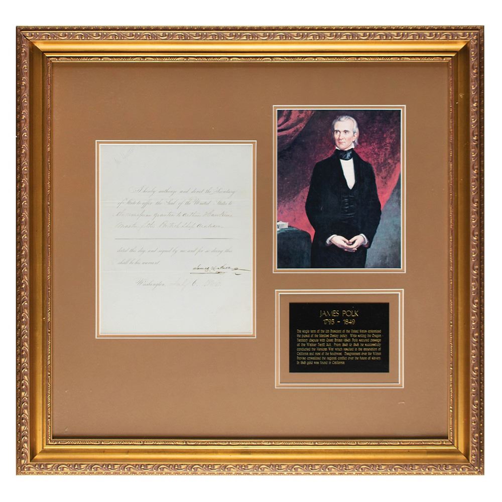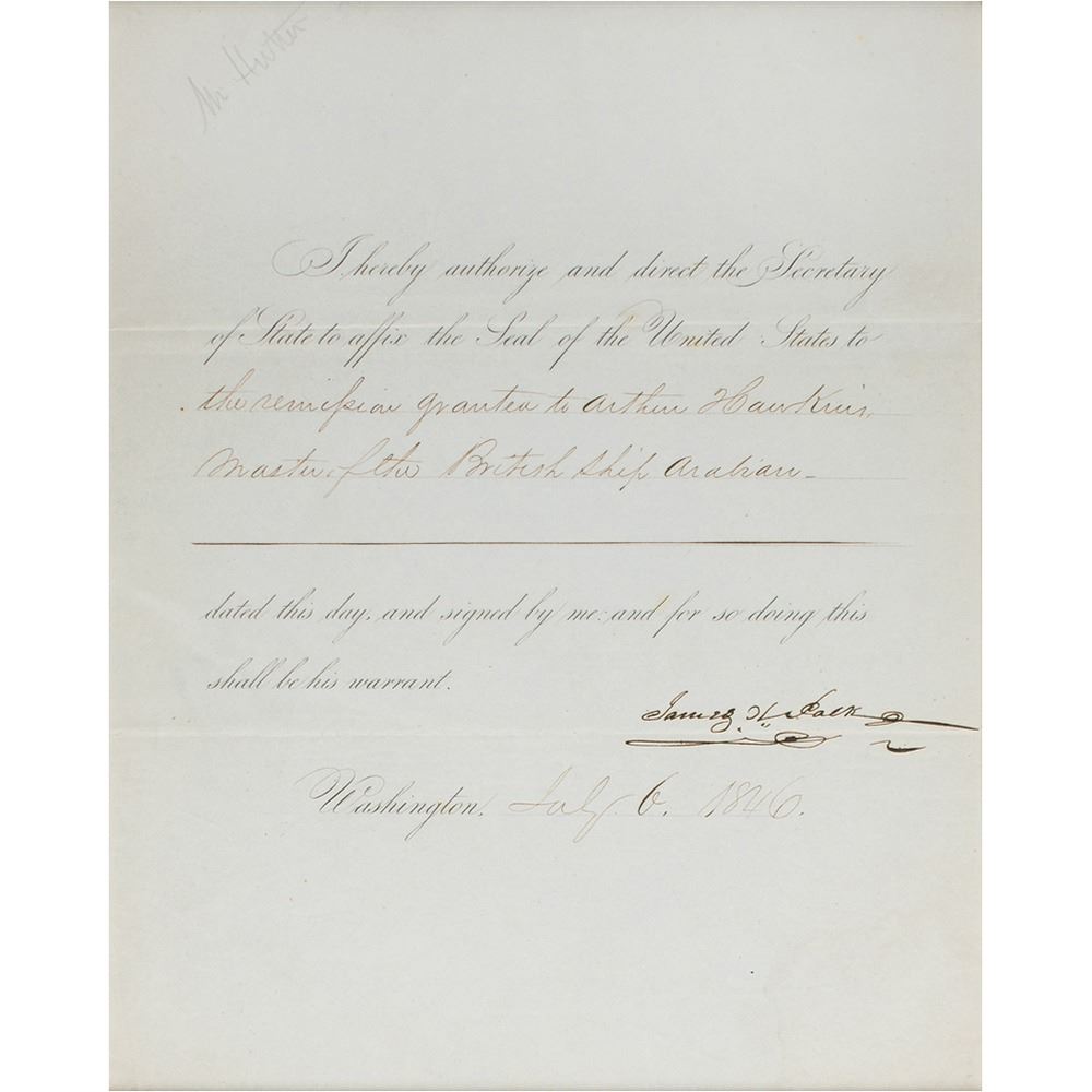 Partly-printed DS as president, one page, 7.5 x 9.5, July 6, 1846. President Polk directs the "Secretary of State to affix the Seal of the United States to the remission granted to Arthur Hawkins, Master of the British Ship Arabian." Signed boldly at the conclusion by Polk. Handsomely double-matted and framed with a portrait and engraved plaque to an overall size of 23.5 x 22.75. In fine condition.