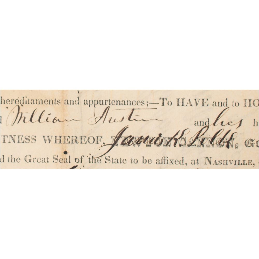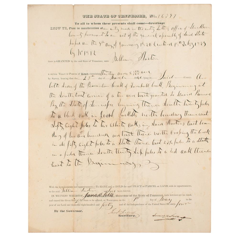 Partly-printed DS, one page, 12 x 15, May 1, 1840. As governor of Tennessee, Polk grants unto William Austin "a certain Tract or Parcel of Land, containing Thirty acres" in Dickson County. Boldly signed at the conclusion by Governor Polk and countersigned by John S. Young as secretary of state. In very good to fine condition, with light toning and staining, splitting to the ends of the intersecting folds, and trivial areas of paper loss along the folds.