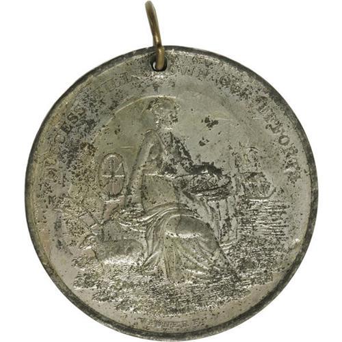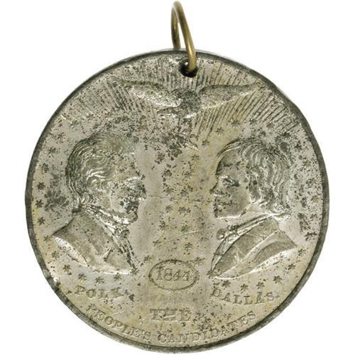 <B>James K. Polk: A Dramatic Large Polk & Dallas Jugate Medal from the 1844 Campaign.</B></I> All campaign items for Polk are scarce and highly collectable. This dramatic large 44mm medal is especially desirable as it depicts both candidates on the obverse side. While collectors tend to take jugate items for granted, they were virtually unknown prior to the appearance of this 1844 issue. Condition is choice, nearly uncirculated, with most of its original luster. Scattered minor tarnish marks. Appears to be original suspension loop at top.<BR><BR><b>Shipping:</b> Miscellaneous Collectibles, Smal (<a target="_blank" href="http://www.heritageauctions.com/common/shipping.php">view shipping information</a>)