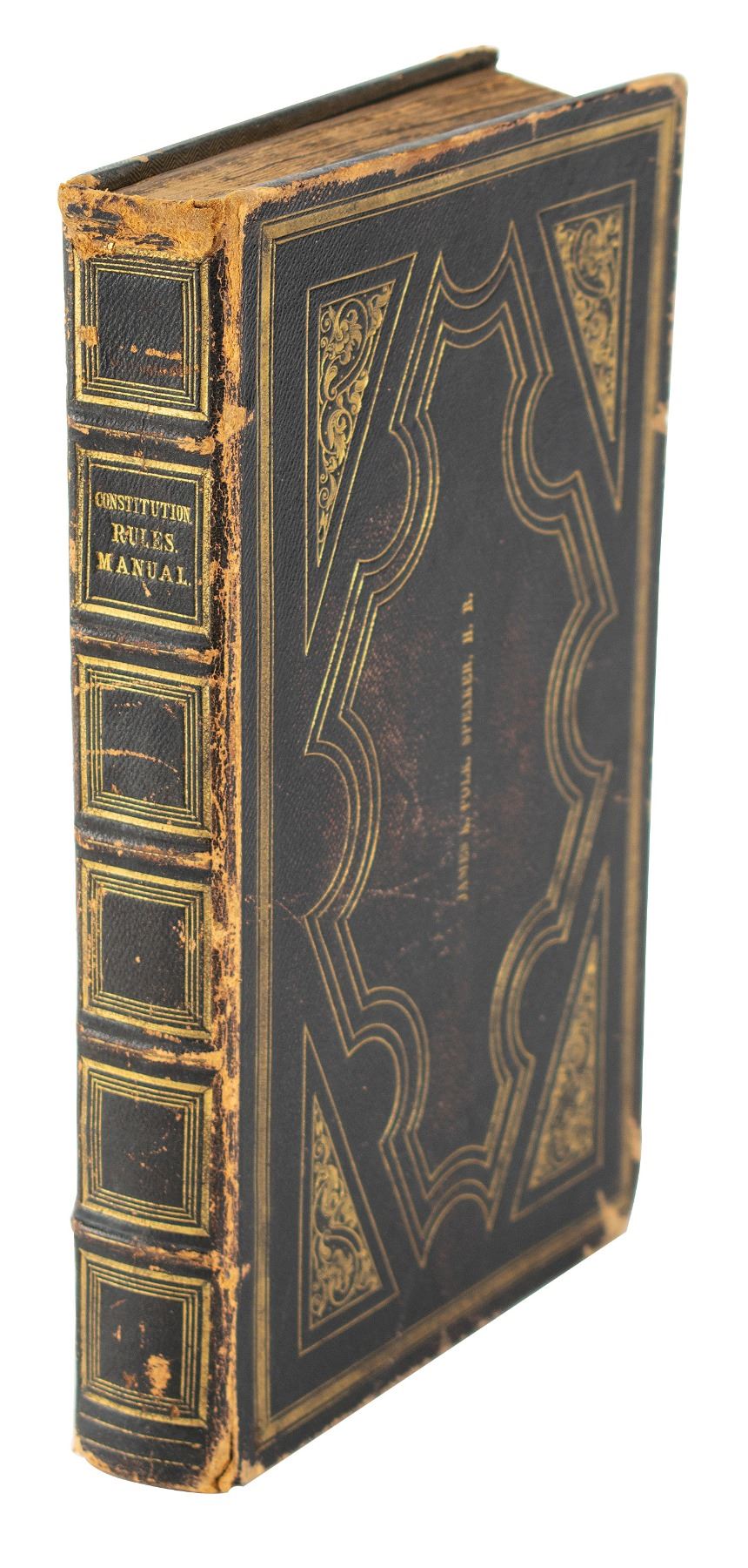 Signed book: Constitution of the United States of America: Rules of the House of Representatives, Joint Rules of the Two Houses and Rules of the Senate, with Jefferson's Manual. Washington: Thomas Allen, Printer to the House, 1937. Hardcover bound in elaborate bespoke morocco gilt- and blind-stamped binding with "James K. Polk, Speaker H. R." Stamped in the center of the upper board, six compartments within raised bands and elaborate gilt ruling on the spine, 6 x 9, 222 pages. Neatly signed on the title page in ink, "James K. Polk." Autographic condition: very good to fine, with moderate overall foxing to the signed page. Book condition: VG/None, with significant edgewear and scuffing, moderate spotting and foxing throughout, and a "Library of Lawrence E. Miller" blindstamp to a rear page.