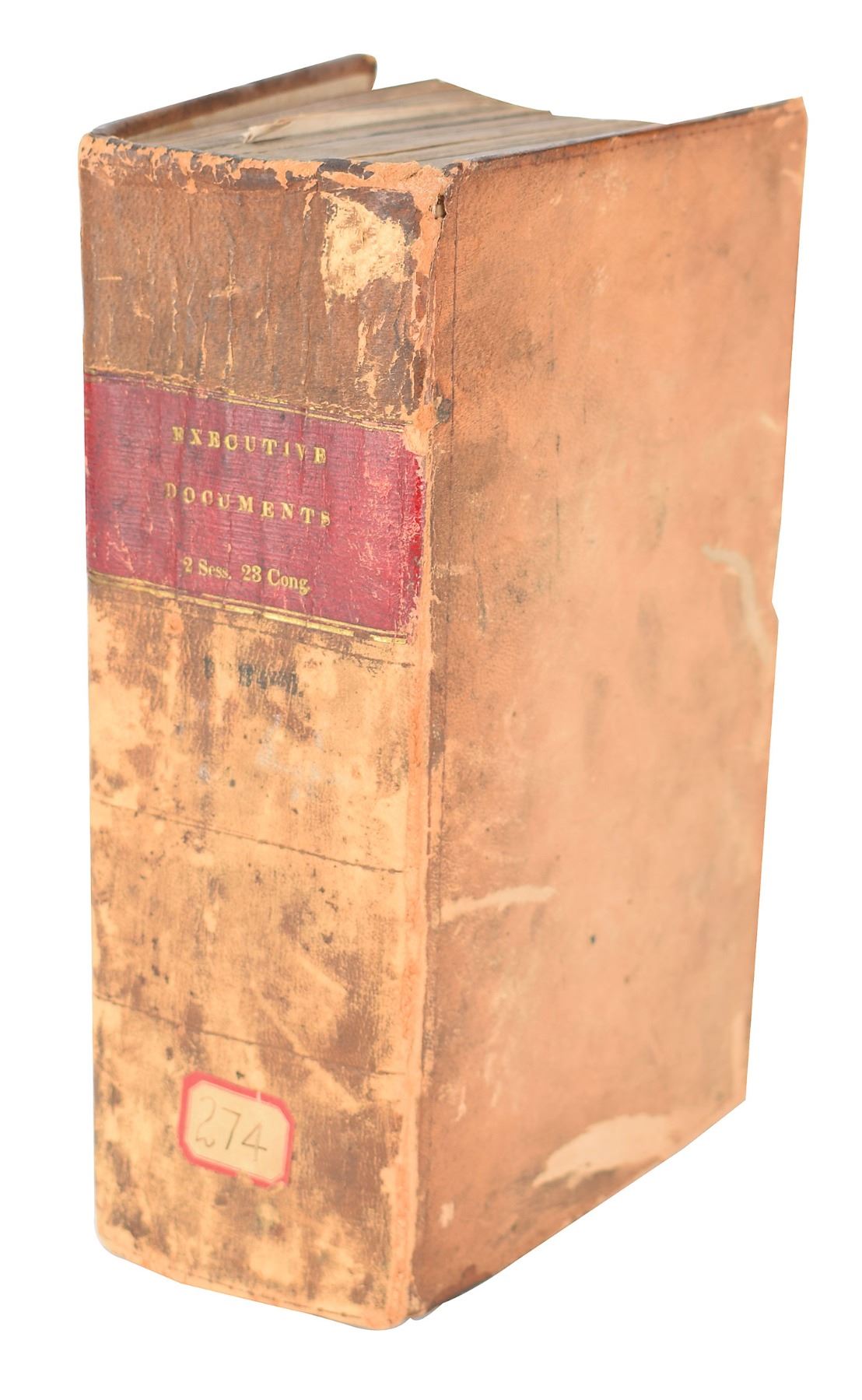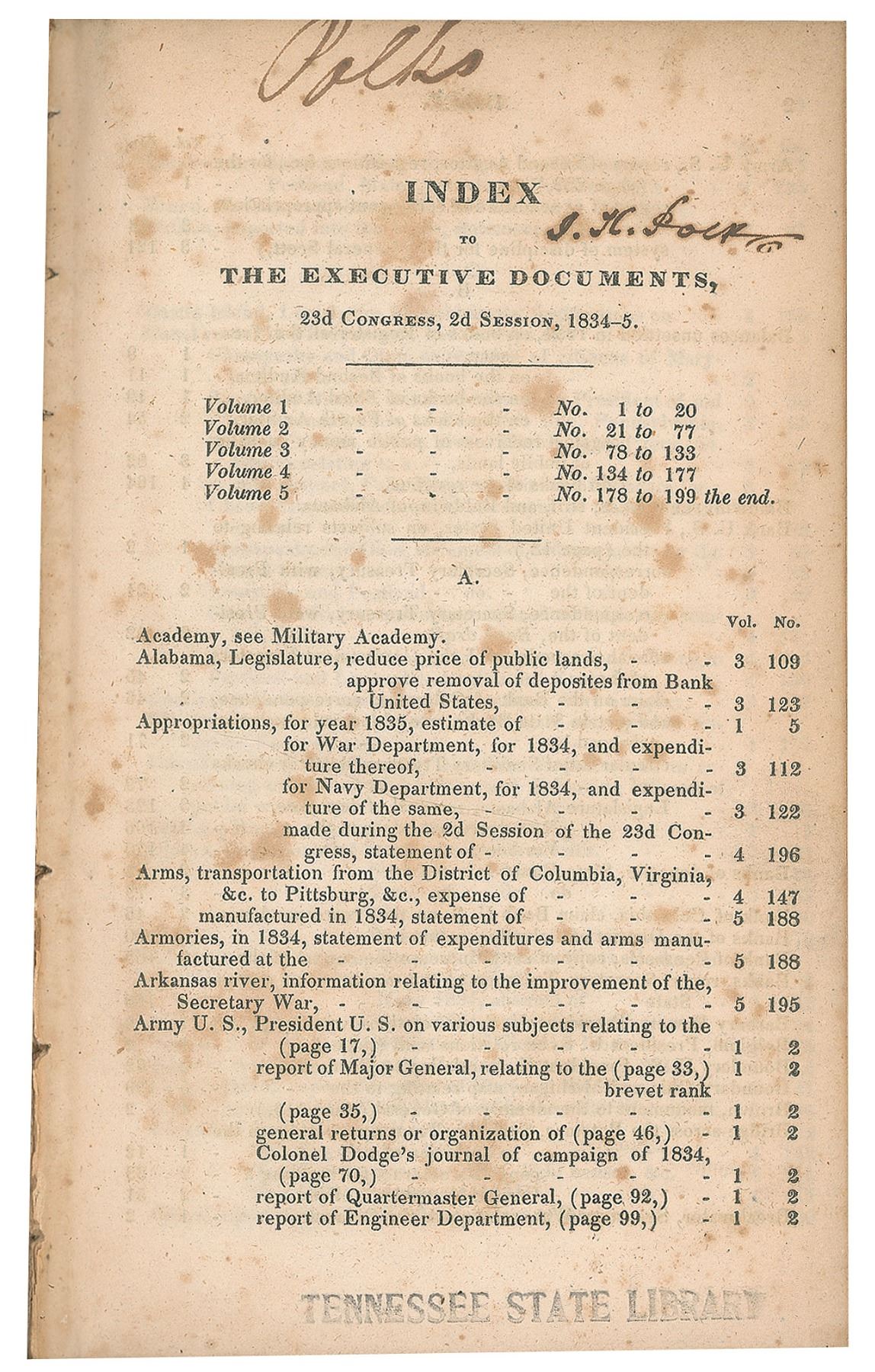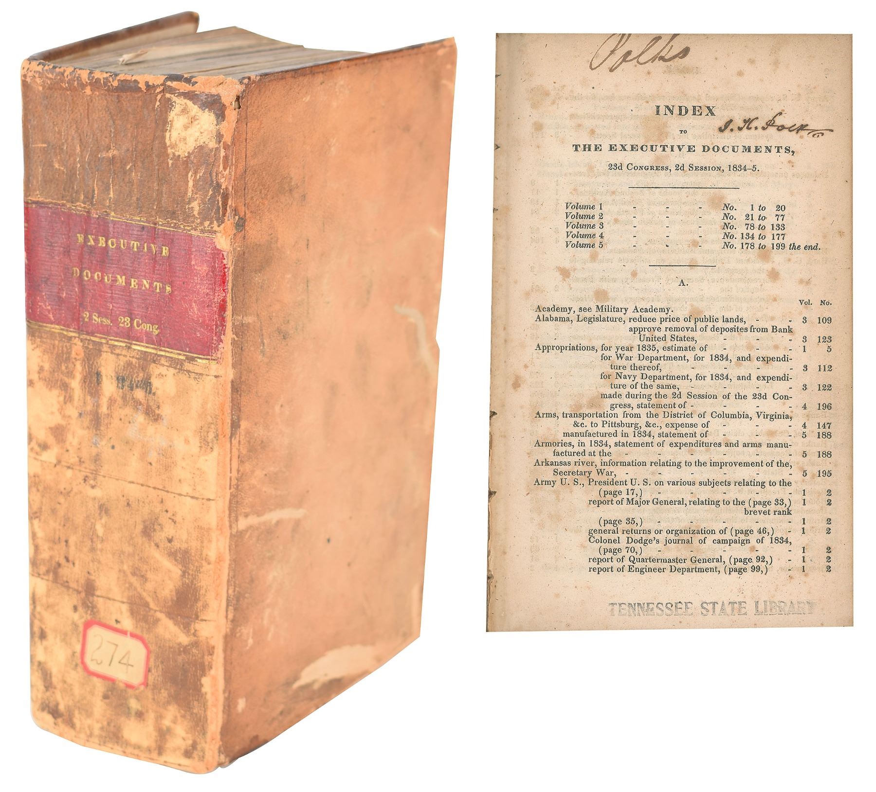 Signed book: Index to the Executive Documents, 23d Congress, 2d Session, 1834–5. Washington: Government Printing Office, 1835. Hardcover bound in contemporary sheep, 6 x 9.25. Signed on the first page in ink, "James K. Polk." The impressively thick volume features several large fold-out map plates. Autographic condition: very good to fine, with a "Polks" notation to the top in an unknown hand, and Tennessee State Library stamp to the bottom. Book condition: VG-/None, with heavy scuffing to exterior, ex-library stamps and notations, and a "Library of Lawrence E. Miller" blindstamp to a rear page.