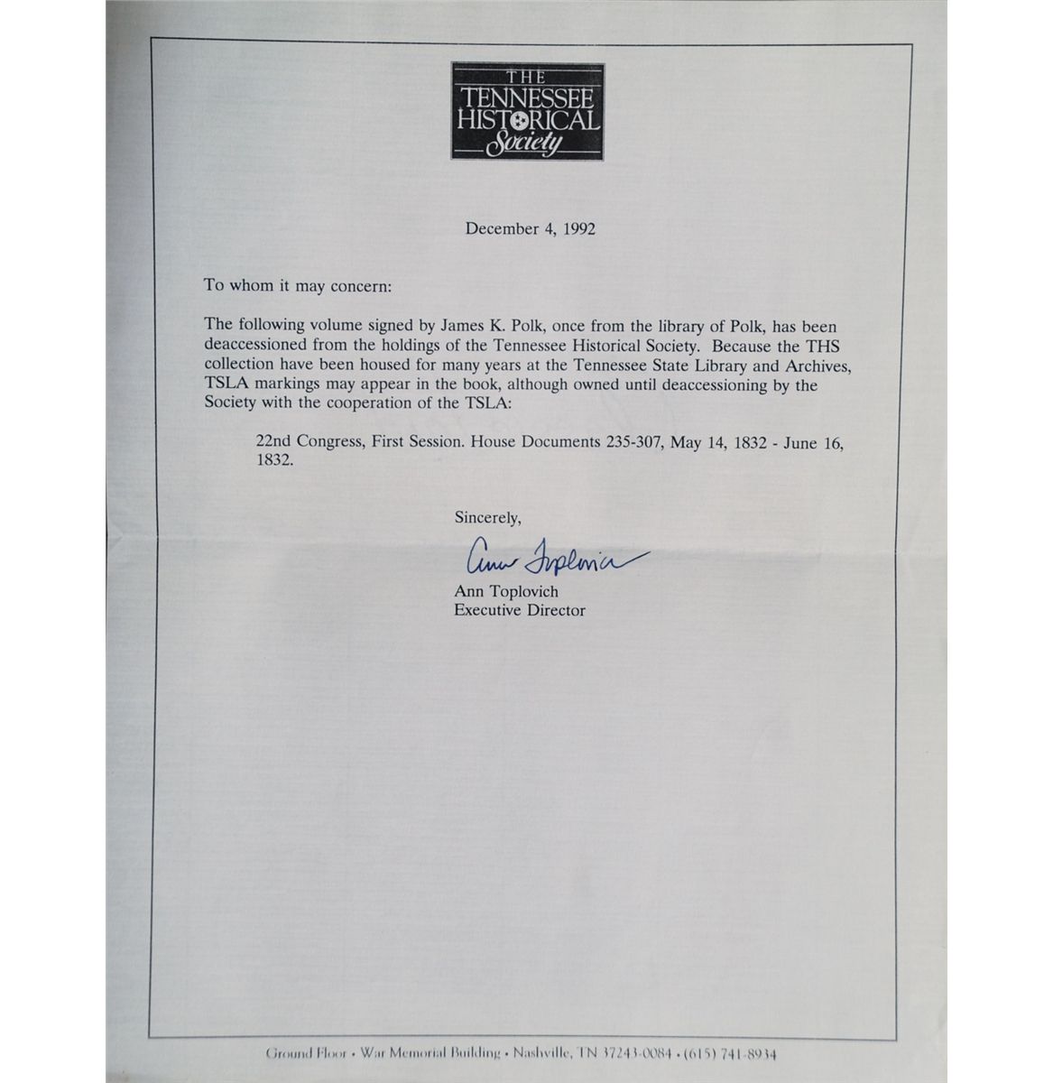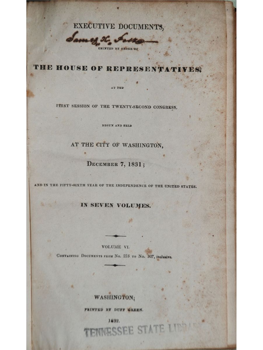 11th president of The United States, Rare "Executive Documents" The House of Representatives at The First Session of the Twenty-Second Congress, Volume VI” signed book, 1831-33. This book was signed by Polk during Andrew Jacksons Presidency. In August 1833, after being elected to this fifth term, Polk became the chair of the House Ways and Means Committee. The book is in very good condition, signed books by Polk are quite uncommon and this one is a fantastic addition to any signed presidential book collection.