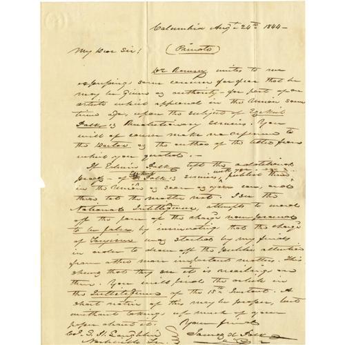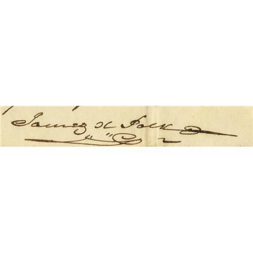 <B>James K. Polk Superb Campaign Autograph Letter Signed</B></I>: During his presidential campaign, the Democratic nominee directs the vindication of his grandfather against Whig charges that he was a Tory during the American Revolution.<BR><BR>Signed: "<I>James K. Polk</B></I>", one page, 7.75" x 9.75". Columbia, August 24, 1844. Addressed on the postmarked integral leaf by Polk to: "<I>Col. Saml. H. Laughlin/Nashville/Tennessee</B></I>". The address leaf is docketed by Laughlin: "<I>Hon. J.K. Polk/Aug. 24, 1844./Wrote to him Sept. 2, 1844/that I had waited ten/days for Com. from L.V./Henry-before publishing/papers left by E. Polk</B></I>." The letter is headed by Polk: "<I>(Private).</B></I>" In full: "<I>My Dear Sir: Dr. Ramsey writes to me expressing some concern for fear that he may be given as authority - for part of an article which appeared in the Union some time ago, upon the subject of Ezekiel Polk's Revolutionary services. You will of course make no reference to the Doctor as the author of the letter from which you quoted. If Edwin Polk left the additional proofs of Ezekiel Polk's services with you, publish them in the Union as soon as you can, and then let the matter rest. I see the National Intelligencer attempts to ward off the form of the charges now proved to be false, by insinuating that the charge of Toryism was started by my friends in order to draw off the public attention from other more important matters. This shows that they see it is recoiling on them. You will find the article in the Intelligencer of the 15th instant. A short notice of this may be proper, but without taking up much of your paper about it. Your friend.</B></I>"<BR><BR>The 1844 Democratic National Convention was held in Baltimore, May 27-30, 1844. There were 266 votes cast. A two-thirds majority, 177, was need for nomination. On the first ballot, former President Martin Van Buren had 146 votes, former Governor of Michigan Territory Lewis Cass had 83 votes, and former Vice President Richard M. Johnson had 24 votes. On each successive ballot, Van Buren's vote total lessened and Cass's votes rose until Cass passed Van Buren on the fifth ballot. On the eighth ballot, Cass had 114 to Van Buren's 104, still a long way from 177. But there was a new name on the ballot: former Governor of Tennessee James K. Polk with 44 votes. New Yorkers switched their support of Van Buren to Polk and, on the ninth ballot, James K. Polk received 233 votes and his nomination was made unanimous. He was the first "dark horse" candidate nominated for President. Earlier in May, the Whigs had nominated Henry Clay on the first ballot by acclamation. Their widely circulated slogan "Who is James K. Polk?" represented the Whig charge of Polk's personal obscurity and insignificance, particularly compared to the national prominence of Clay. Whigs spread a lie that Polk's grandfather Ezekiel was a Tory during the Revolutionary War. Polk took personal charge of this accusation. As is evident by this letter, Polk treated the charge against his grandfather very seriously. He devoted far more time and energy to these charges than to any other issue in the campaign. His old friend Dr. James G.M. Ramsey spent practically his whole time during the campaign gathering evidence and writing refutations. Under Polk's direction, Col. Laughlin published a pamphlet, "A Vindication of Colonel Ezekiel Polk" and ten thousand copies were distributed.<BR><BR><B>Ezekiel Polk</B></I> (1747-1824) was, in fact, a surveyor in North Carolina and, in the Revolutionary War, was a Captain in the North Carolina Militia. After his property was occupied by the British, he joined the South Carolina Militia and became Lieutenant Colonel of the 12th Regiment.<BR><BR><B>Edwin Polk</B></I> (1818-1854) was a member of the Tennessee State Legislature and was James K. Polk's cousin.<BR><BR><B>Col. Samuel H. Laughlin</B></I> (1796-1850) was a lawyer, Tennessee State Senator (1838-1844), and editor of the <I>Nashville Union</B></I> (1840-1843). President Polk appointed him Recorder of the General Land Office (1845-1850).<BR><BR><B>Dr. James G. M. Ramsey</B></I> (1797-1884) was a physician, banker, railroad advocate, scholar, and staunch secessionist. An historian of Tennessee's early settlement history, Dr. Ramsey published <I>The Annals of Tennessee to the End of the Eighteenth Century</B></I> in 1853. In 1861, Ramsey was a staunch states' rights Democrat who publicly supported secession and served as a treasury agent and field surgeon for the Confederacy. After the war, he was granted amnesty by friend and fellow Tennessean, President Andrew Johnson.<BR><BR>Democrat James K. Polk defeated Whig Henry Clay in the election. Polk won 170 electoral votes (15 states) to Clay's 105 votes (11 states). It was disappointing to Polk that not only didn't he win Tennessee, but his hometown of Columbia went for Clay.<BR><BR>The integral leaf is addressed by Polk. There is a small nick at the left edge as a result of the letter being opened by Laughlin. This full page letter is in extra fine condition. ALsS of Polk have always been scarce because of his relatively short time on the national political scene and the fact that he died just three months after leaving the White House. Presidential campaign letters written by a candidate elected President, especially those with family content, are rarely encountered and this one concerning a personal attack on the nominee's grandfather is particularly desirable and would be an exceptional addition to a presidential collection. <I>From the Gary Grossman Collection.</B></I><BR><BR><b>Shipping:</b> Flat Material, Small (<a target="_blank" href="http://www.heritageauctions.com/common/shipping.php">view shipping information</a>)