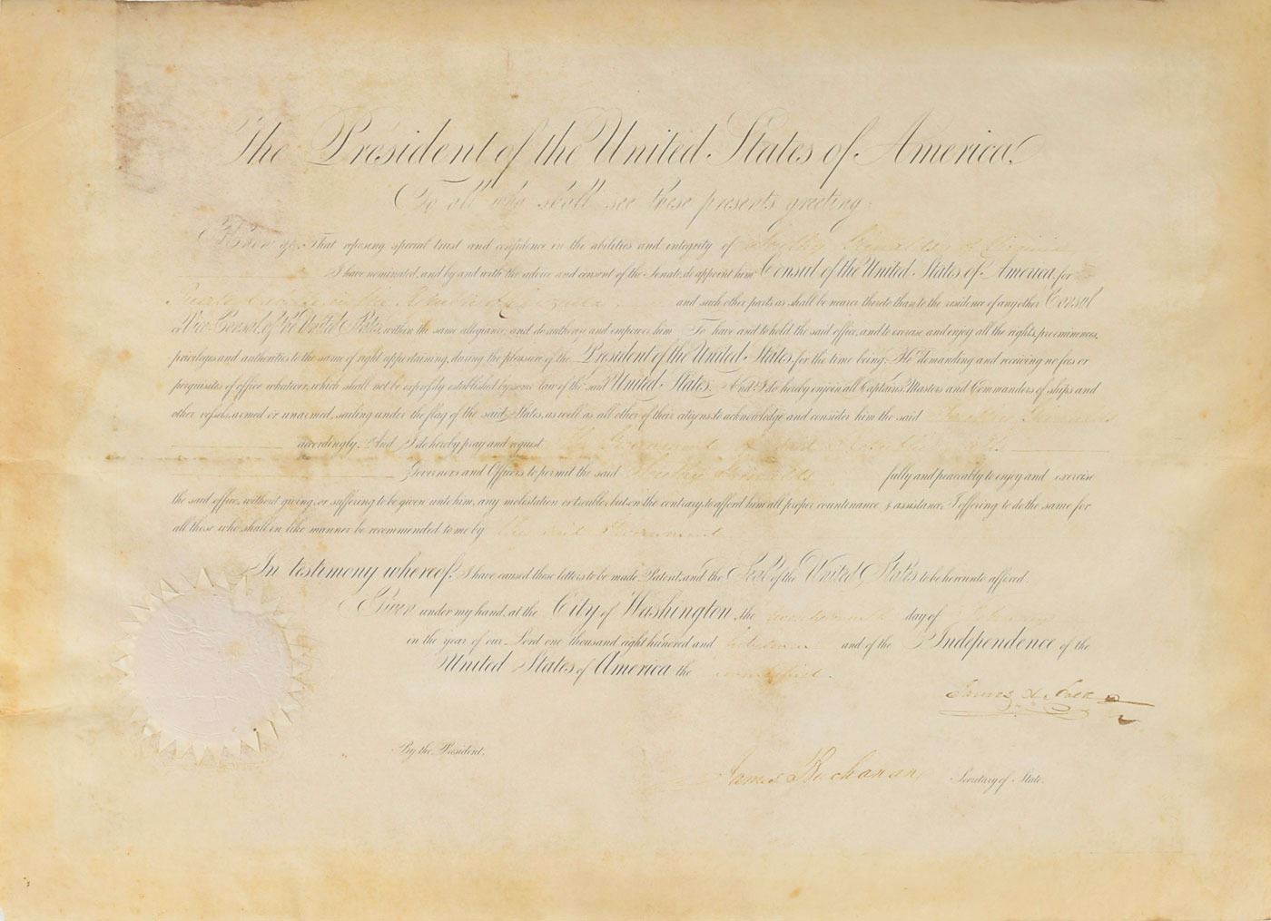 Partly-printed vellum DS, signed "James K. Polk" as president and "James Buchanan" as secretary of state, one page, 19.5 x 14.5, February 27, 1847. President Polk appoints Southy Grinalds, of Virginia, as "Consul of the United States of America for Puerto Cabello, in the Republic of Venezuela." Signed at the conclusion by both Polk and Buchanan. White paper seal remains affixed to lower left corner. In very good condition, with overall toning and soiling; all of the writing is light, but the two signatures are a bit darker and completely legible.