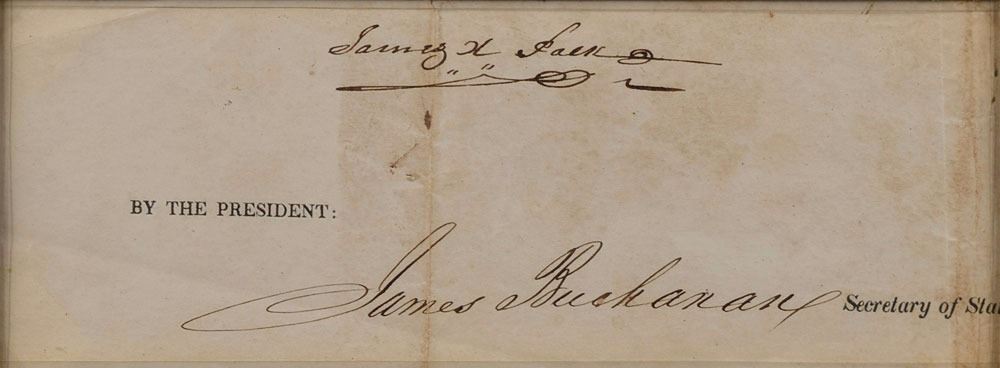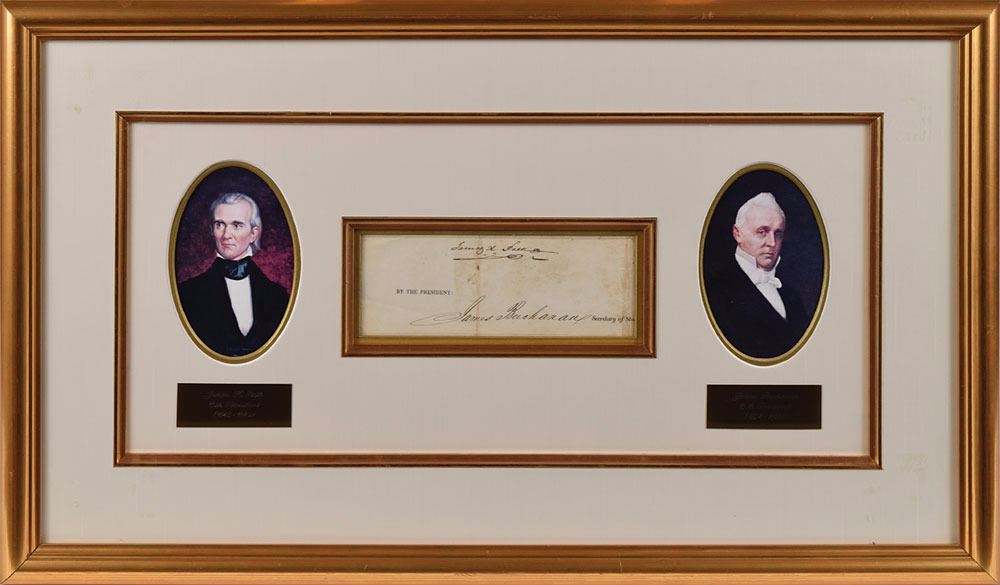 Ink signatures, "James K. Polk" as president and "James Buchanan" as secretary of state, on an off-white 7 x 2.5 sheet clipped from the close of a document. Double-matted and framed with two plaques and portraits to an overall size of 25.5 x 15. In very good to fine condition, with light creasing, soiling, and a central vertical fold.