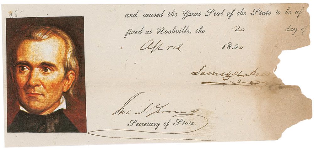 Ink signature as Governor of Tennessee, “James K. Polk,” on an off-white 6.5 x 3 slip clipped from the bottom of a larger document dated April 20, 1840, featuring a clipped image of Polk affixed to the left edge. In good condition, with a central horizontal fold, and heavy toning and paper loss affecting appearance and the end portion of the signature.