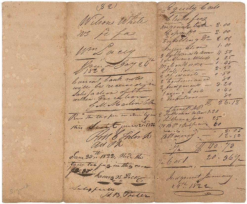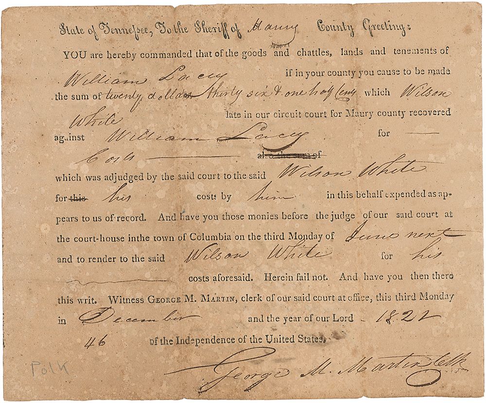 Early handwritten endorsement, “June 25th, 1822, Rec’d the…tax…in this sum, James K. Polk” on the reverse of a partly printed document related to the payment of fines and costs in a legal case heard in the circuit court at Maury County, Tennessee. In very good condition, with scattered toning and spotting and a couple of minor edge tears. Polk’s writing is dark and distinct.