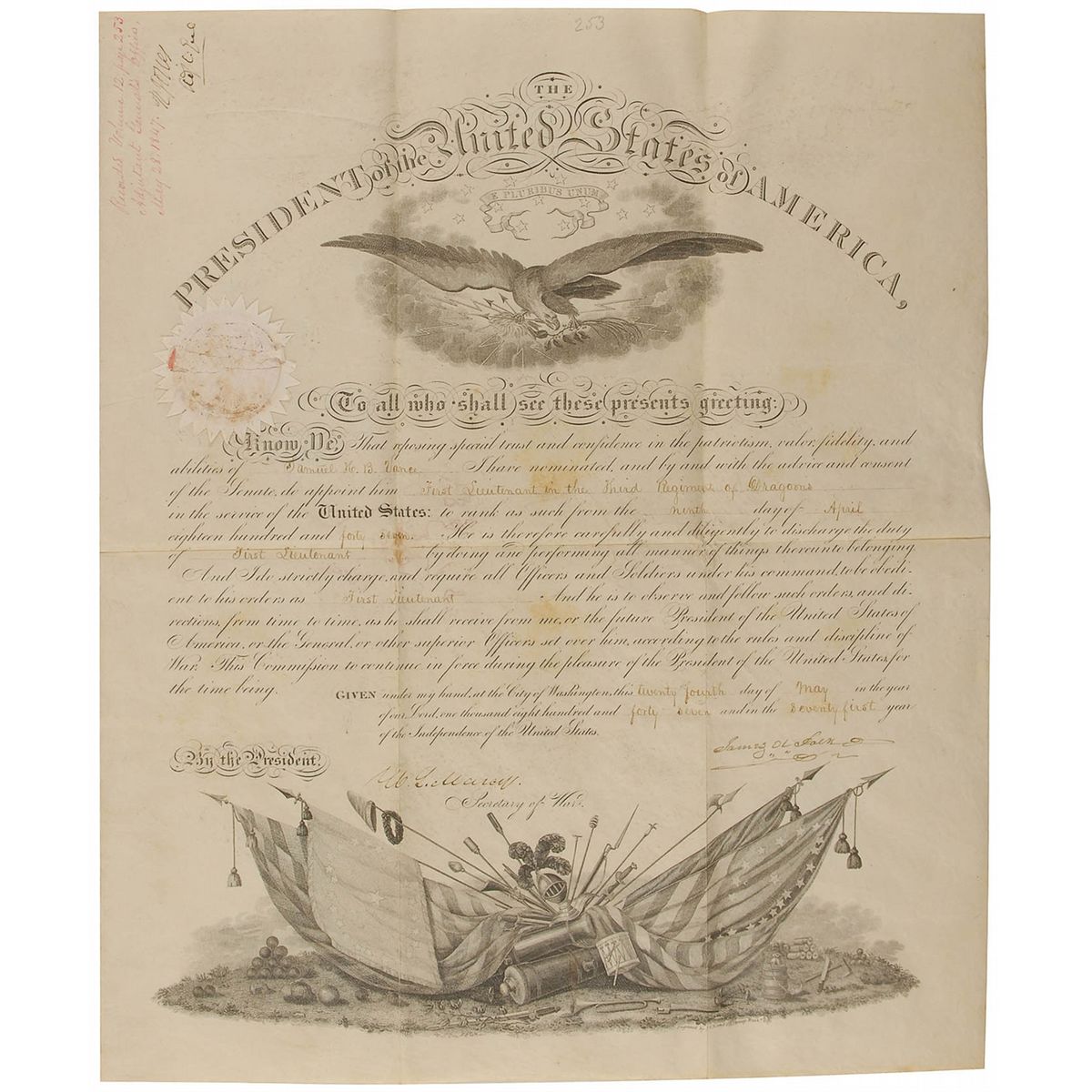 Partly-printed vellum DS as president, one page, 14.5 x 17.5, May 24, 1847. Polk appoints Samuel H. B. Vance “First Lieutenant in the Third Regiment of Dragoons in the service of the United States.” Signed at the conclusion by Polk and countersigned by Secretary of War William Marcy. In very good condition, with intersecting storage folds, scattered toning, light wrinkling, and a small ink notation to top edge. The paper seal is cracked and toned, but mostly intact.