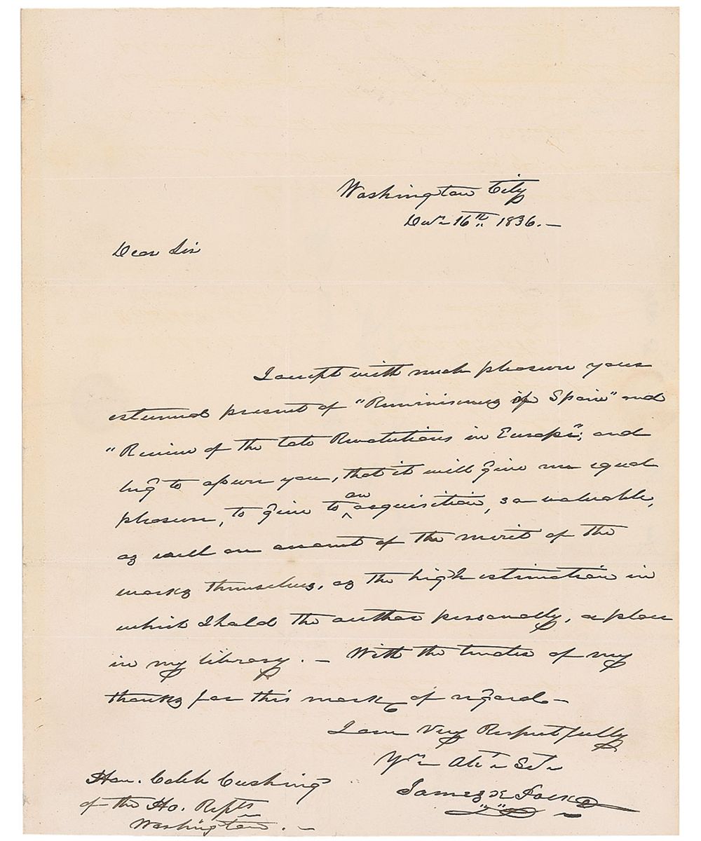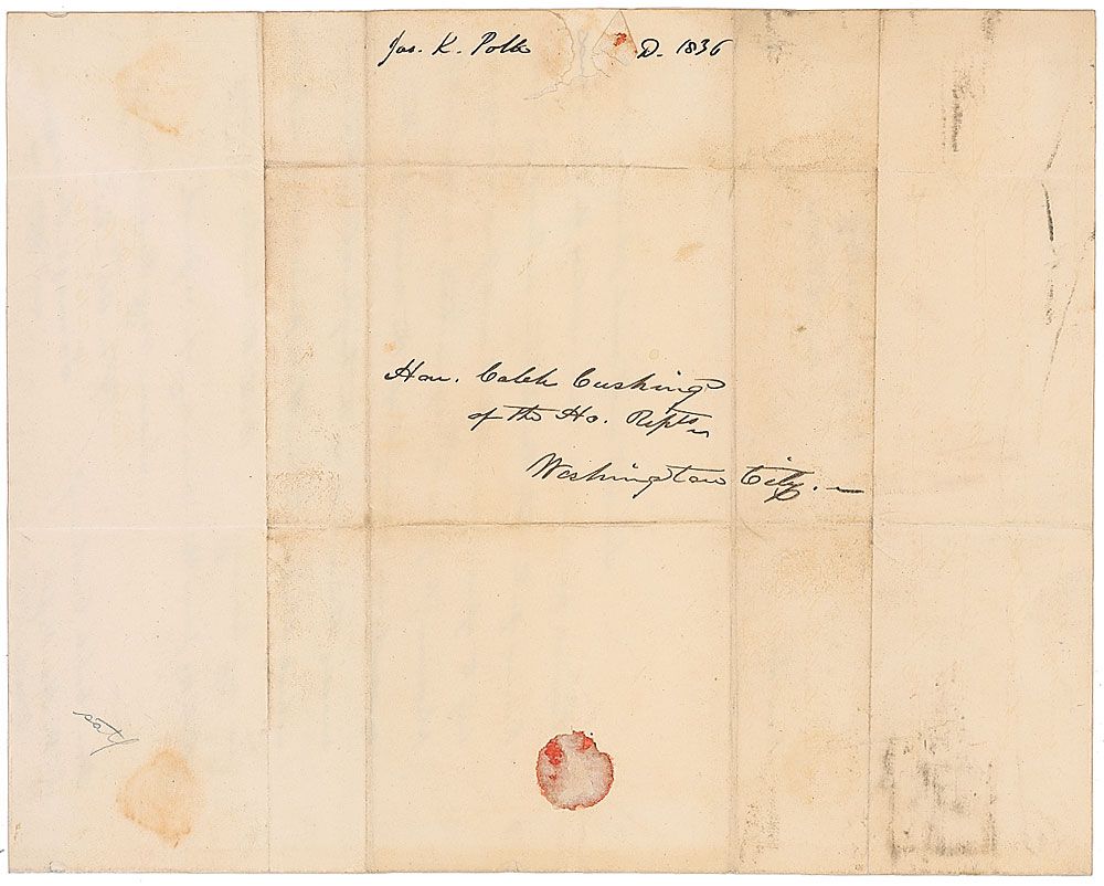 ALS, one page, 8 x 10, October 16, 1836. Letter to Congressman Caleb Cushing. In part: “I accept with much pleasure your esteemed present of ‘Reminiscences of Spain’ and ‘Review of the Late Revolutions in Europe;’ and beg to assure you, that it will give me equal pleasure, to give…the author personally, a place in my library.” Panel to reverse of second integral page is also addressed in Polk’s hand. Intersecting folds (one vertical fold passing through a single letter of the signature), light scattered creases and toning, and slight paper loss to second integral page, otherwise fine condition.