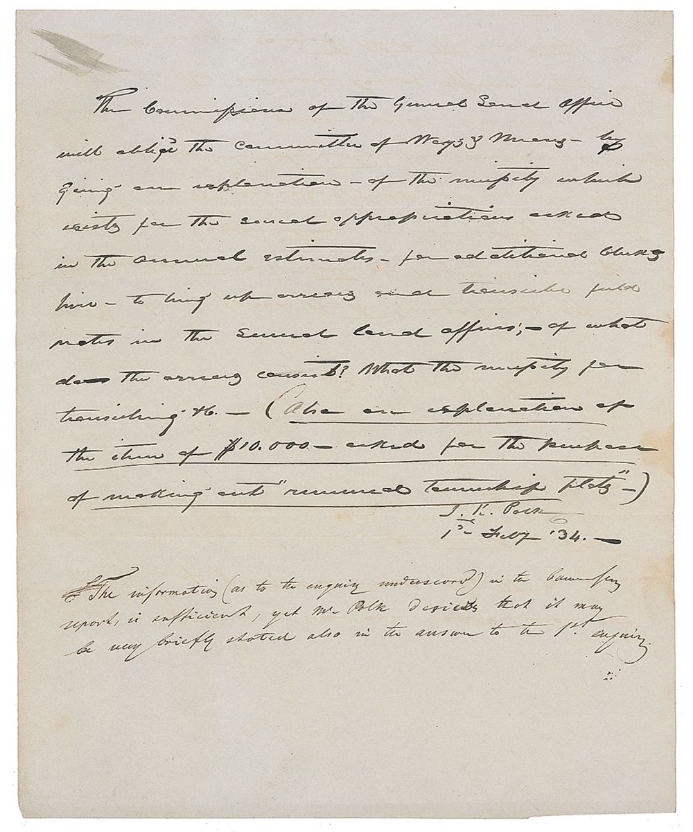 ALS signed “J. K. Polk,” one page, 7.75 x 9.5, February 1, 1834. Letter to Commissioner of the General Land Office Elijah Hayward. In full: “The Commissioner of the General Land Office will oblige the Committee of Ways & Means–by giving an explanation of the necessity which exists for the several appropriations asked in the annual estimates–for additional clerks hire–to bring up arrears and transcribe field notes in the several land offices;-of what do the arrears consist? What the necessity for transcribing &c – (Also an explanation of the item of $10,000–asked for the purchase of making out ‘renamed township plots-)” Hayward has underlined the last three lines of the text, and written under the text, “The information (as to the enquiry underscored) in the Commissioners report, is sufficient, yet Mr. Polk depicts that it may be very briefly stated also in the answer to the 1st enquiry.” In fine condition, with some scattered light toning and soiling and an ink brush to top left corner.