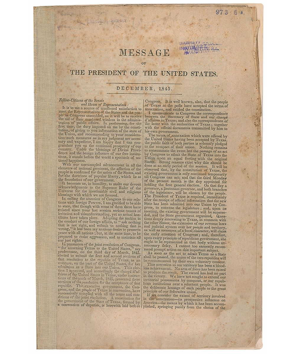 Printed address of Polk’s address to the Senate on December 9, 1845, 6.25 x 9.5, eight pages, housed in a contemporary folder. Polk’s State of the Union address concerning the annexation of Texas and the country’s relationship with Mexico. In small part: “The terms of annexation which were offered by the United States having been accepted by Texas, the public faith of both parties is solemnly pledged to the compact of their union. Nothing remains to consummate the event but the passage of an act by Congress to admit the State of Texas into the Union upon an equal footing with the original States.” In very good condition, with moderate foxing and dampstaining to pages, several stamps to first page, and some creasing and wrinkling.