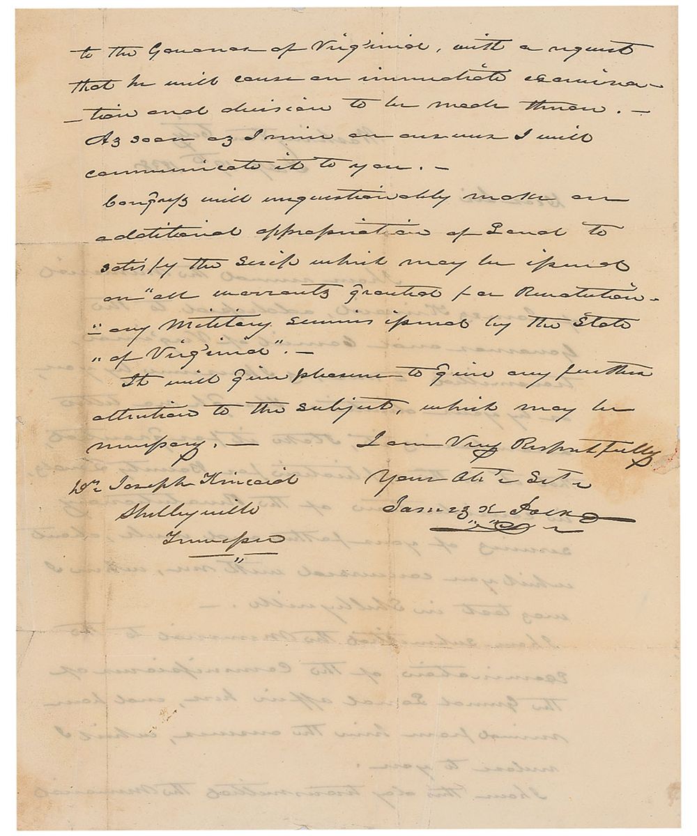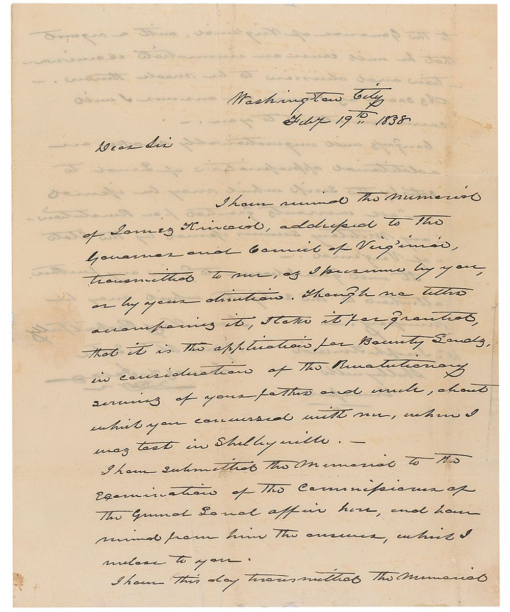 ALS, one page both sides, 8 x 10, February 19, 1838. Letter to Dr. Joseph Kincaid of Tennessee. In part: “I have received the memorial of James Kincaid, addressed to the Governor and Council of Virginia, transmitted to me, as I presume by you, or by your direction. Though no letter accompanies it, I take it for granted, that this is the application for Bounty Lands, in consideration of the Revolutionary Services of your father and uncle…I have submitted the memorial to the examination of the Commissioner of the General Land affair here, and I have received from him the answers, which I enclose to you. I have this day transmitted the memorial to the Governor of Virginia, with a request that he will cause an immediate examination and decision to be made…Congress will unquestionably make an additional appropriation of land…issued on ‘all warrants granted for Revolutionary Military services issued by the State of Virginia.’” The letter has been removably archivally sleeved in acid free Mylar. In fine condition, with intersecting folds, one through the first letter of signature, and a small circular area of toning from a previous seal.