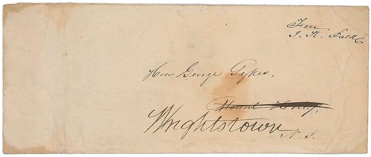 Free-franked envelope, 8.75 x 3.5, addressed in another hand to New Jersey congressman, “Hon. George Sykes, Wrightstown, N. J.,” with a Mount Holly address crossed out in the second line, and franked in the upper right, “Free, J. K. Polk.” In very good condition, with a vertical fold to left side, scattered creases, a couple lightly passing through signature, and a spot of toning to center. The reverse of the envelope retains most of its worn red wax seal.