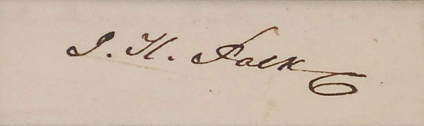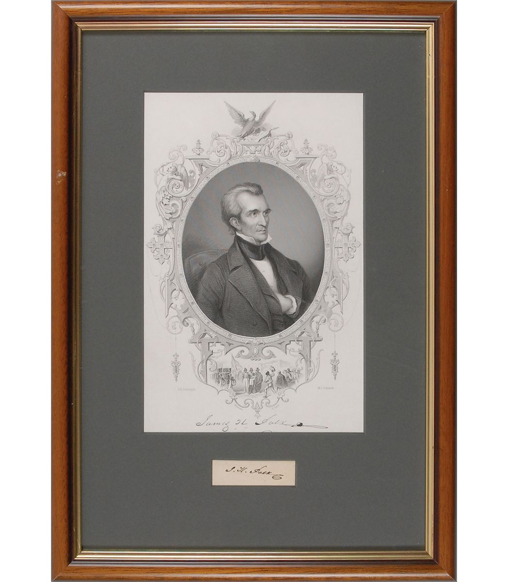 Ink signature, “J. K. Polk,” on an off-white slip. Matted and framed with an engraved portrait bearing a pre-printed signature to an overall size of 11.5 x 16.5. In fine condition.