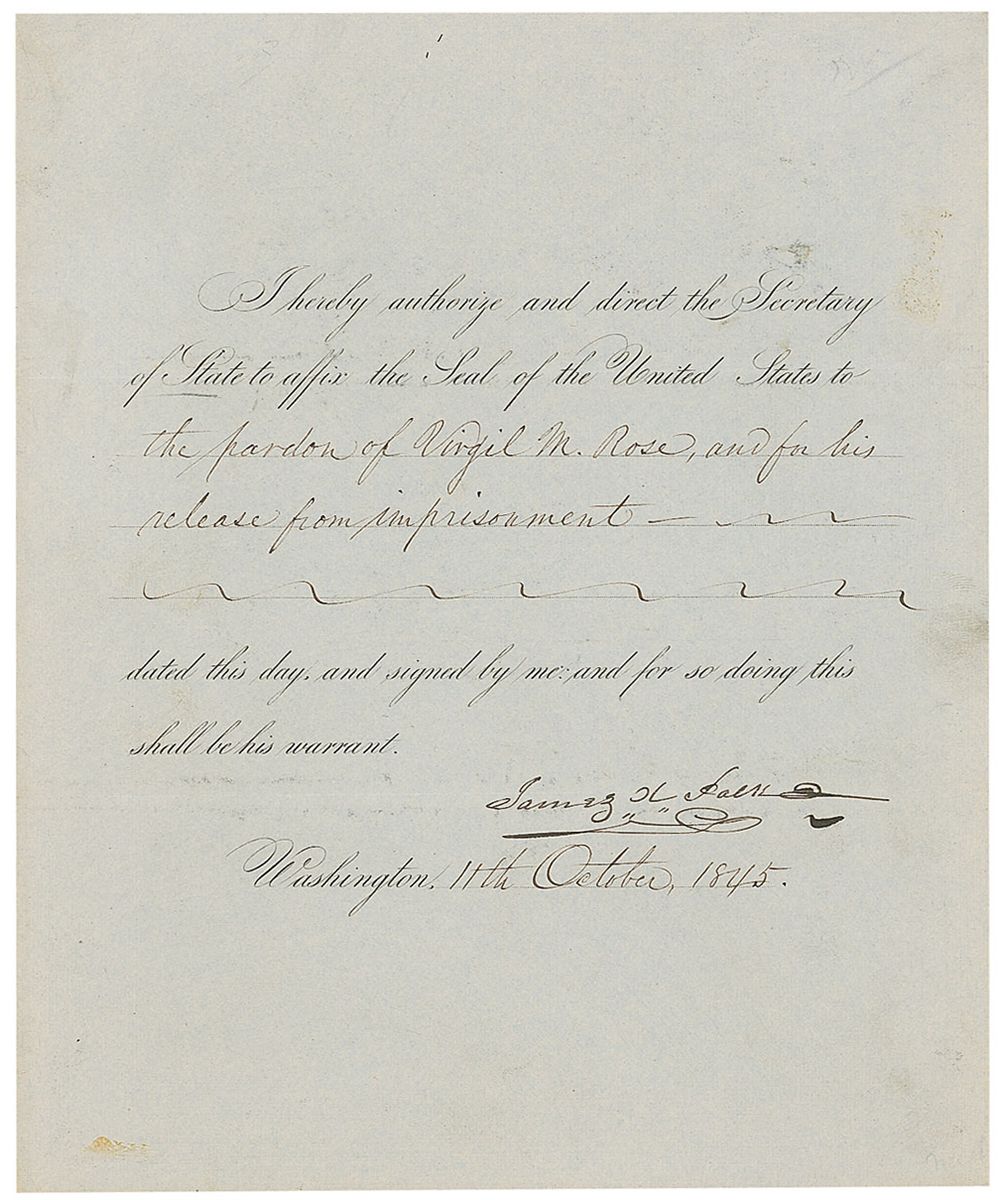 Partly-printed DS as president, one page, 7.75 x 9.5, October 11, 1845. President Polk directs the secretary of state “to affix the Seal of the United States to the pardon of Virgil M. Rose, and for his release from imprisonment.” Boldly signed at the conclusion by Polk. Affixed by the left side to a slightly larger sheet. In fine condition, with a couple areas of subtly toned adhesive remnants and a thumbprint to the right edge. Polk pardons are quite uncommon, this being just the fifth we have offered.