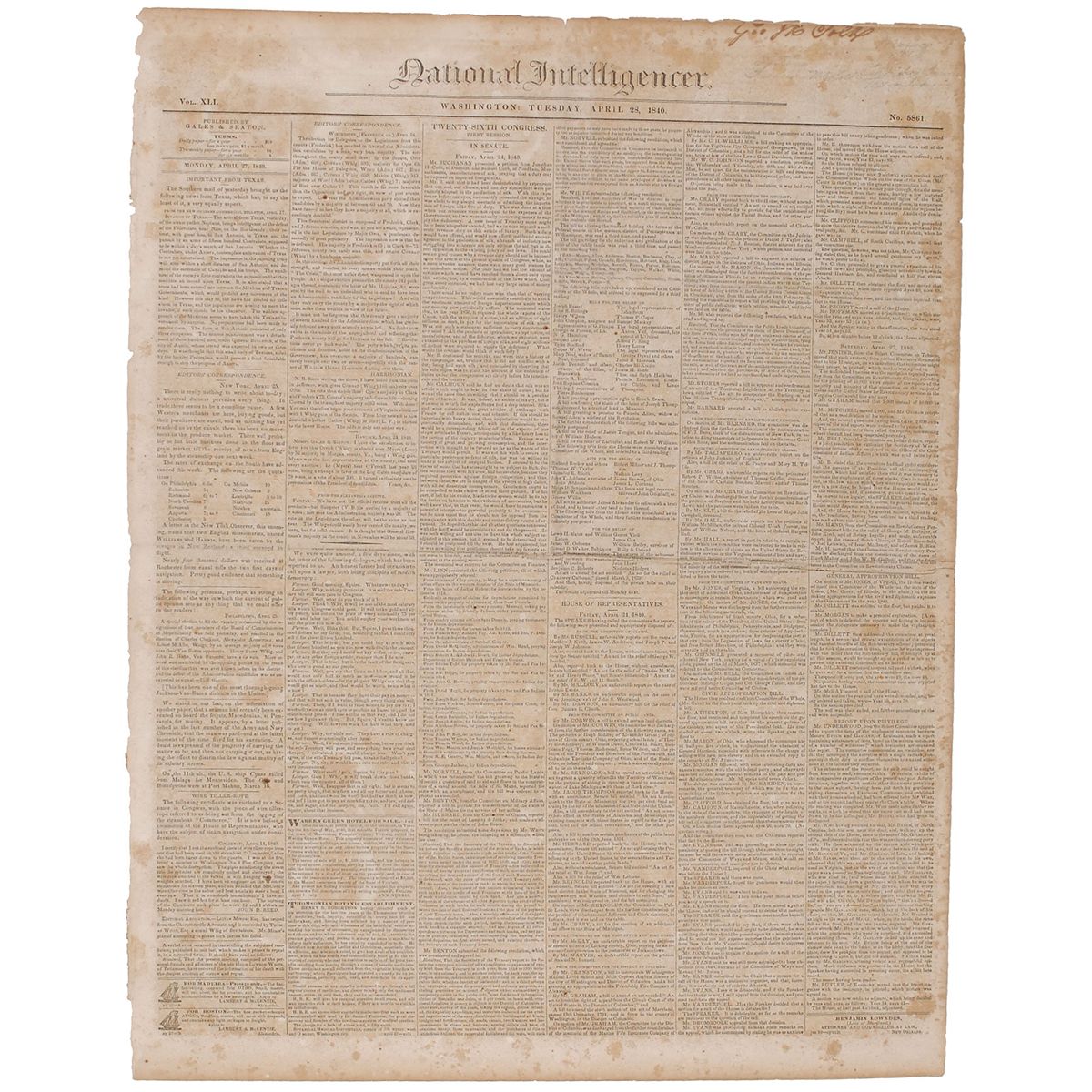 James K. Polk's copy of the complete Tuesday, April 28, 1840, edition of Washington's National Intelligencer newspaper, four pages, 18 x 23, featuring important news about Texas and congressional proceedings, with the upper right labeled “Gov. JK Polk” in an unknown hand. The lead story in the first column is headed "Important From Texas," with a sub-headline, “Invasion of Texas,” and reports about the victory of Mexican Centralist troops under General Arista over Federalists led by General Canales near San Antonio. The article states that "the news has created no little alarm in Texas, and the population are arming to meet the invader, if such should be his character. The sudden approach of the Mexicans seems to have taken the Texian Government by surprise." In very good condition, with fragile storage folds and significant staining. As president, Polk was deeply involved with Texas, annexing and granting statehood to it; this western expansion led to the Mexican-American war, through which the United States acquired a large amount of territory.
