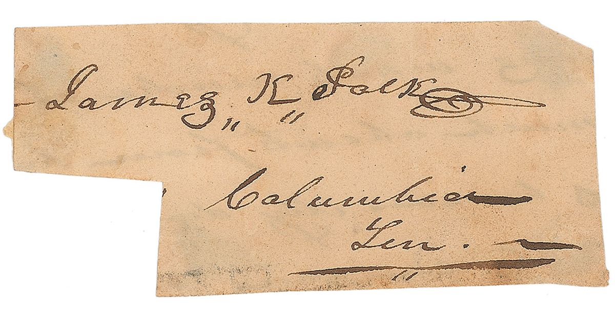 Ink signature, “James K. Polk,” on an off-white 3 x 1.5 clipped slip, with “Columbia, Tenn.,” added below in another hand. In fine condition, with uniform toning.