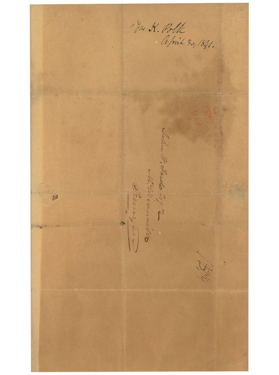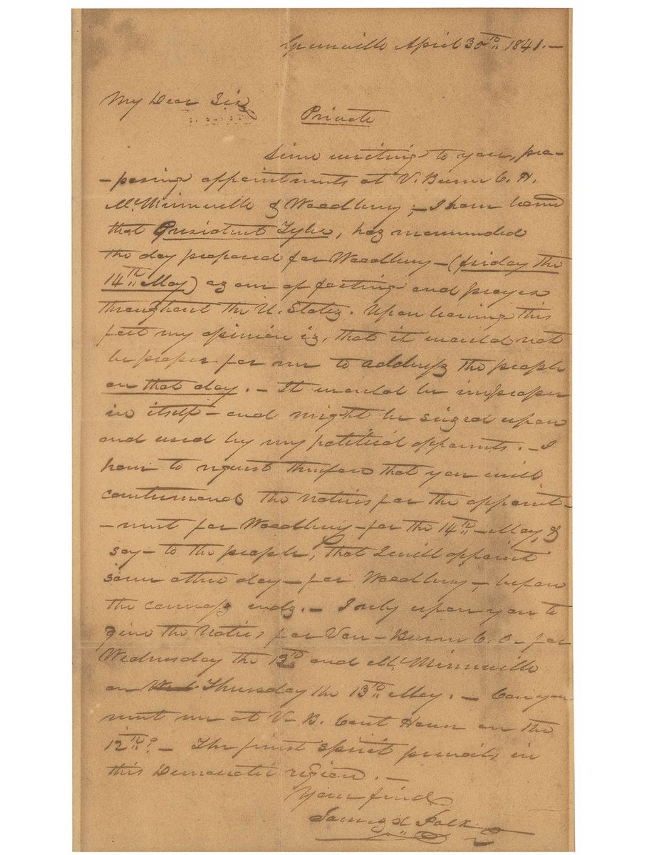 ALS, one page, 7.25 x 12.25, April 30, 1841. Letter to John W. Ford, marked “Private” at the top by Polk. In full: “Since writing to you proposing appointments at V. Buren C.H. McMinnville & Woodbury, I have learned that President Tyler has recommended the day preferred for Woodbury—(Friday the 14th May) as one of fasting and prayer throughout the U. States. Upon learning this fact my opinion is that it would not be proper for me to address the people on that day. It would be improper in itself—and might be seized upon and used by my political opponents. I have to request therefore that you will countermand the notices for the appointment for Woodbury—for the 14th May, & say to the people, that I will appoint some other day—for Woodbury—before the canvass ends. I rely upon you to give the notices for Van Buren C.H. for Wednesday the 12th and McMinnville on Thursday the 13th May. Can you meet me at V.B. Court House on the 12th? The finest spirit prevails in this Democratic region." Reverse of second integral page is addressed in Polk’s hand to Ford. In very good condition, with letter having been professionally silked, intersecting folds, and uniform toning from previous display. Polk would lose the upcoming Tennessee gubanatorial election to James C. Jones, and lose to him again two years later. When William Henry Harrison died after only serving 32 days in office, President Tyler declared a national day of mourning three weeks later. A respectful nod to the recently-deceased president, despite Polk’s urgent need to campaign.