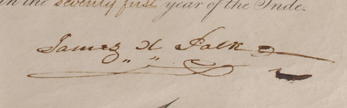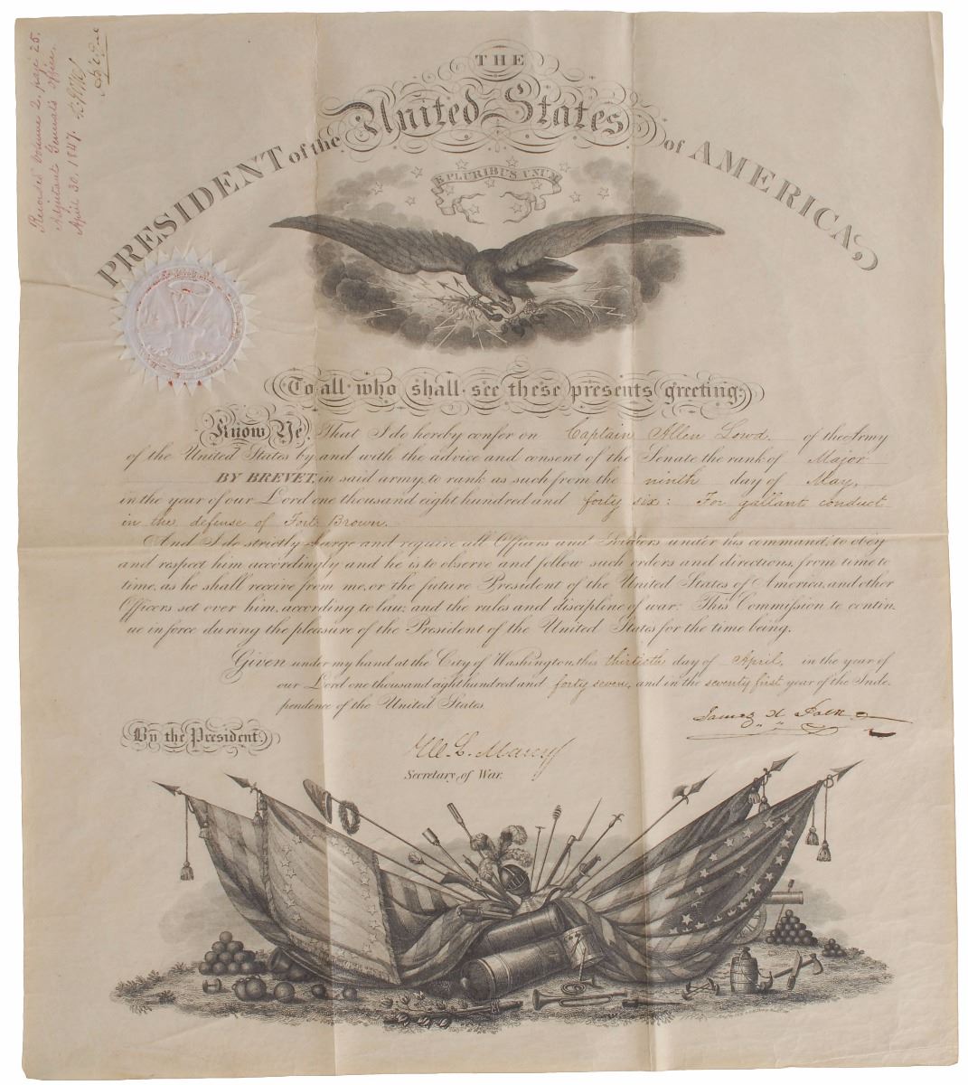 Partly-printed DS as president, one page, 14.75 x 17, April 30, 1847. President Polk promotes Allen Lowd to “the rank of Major by Brevet…For gallant conduct in the defense of Fort Brown.” Signed at the conclusion by Polk, and countersigned by Secretary of War William Marcy. The embossed white paper seal affixed to upper right remains intact. Intersecting folds, a uniform shade of overall toning, and some light creasing and wrinkling, otherwise fine condition.