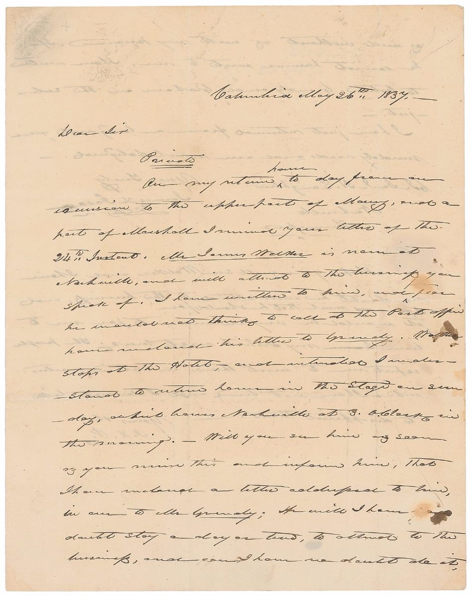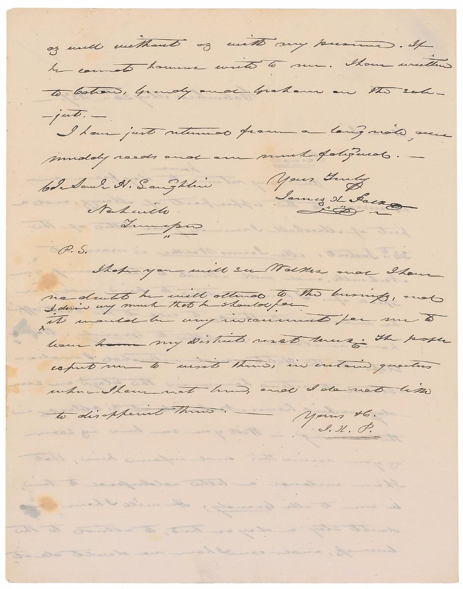 ALS, one page both sides, 7.75 x 10, May 26, 1837. Letter to Col. Samuel H. Laughlin, written while serving as Speaker of the House. In part: “Mr. James Walker is now at Nashville, and will attend to the business you speak of…Will you see him as soon as you receive this…He will I have [no] doubt stay a day or two, to attend to the business…I hope you will see Walker and I have no doubt he will attend to the business, and I desire very much that he should for it would be very inconvenient for me.” Polk also adds a postscript, signing with his initials, “J. K. P.” Intersecting folds (a couple passing through the signature), and small stains and ink blots affecting a few words, otherwise fine condition.