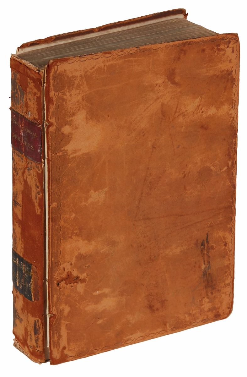 Signed book: Register of Debates in Congress, Part II of Vol. IX. Washington: Gales and Seaton, 1833. Hardcover, 6.75 x 10, approximately 640 pages. Boldly signed on the title page in black ink with his ownership signature, "J. K. Polk." Autographic condition: very good, with scattered light discoloration and toning. Book condition: G-/None, with front board detached and rear board nearly detached, scuffing and flaking to leather, and rubbing to spine; deaccessioned from the Tennessee Historical Society and bears a few library stamps inside.