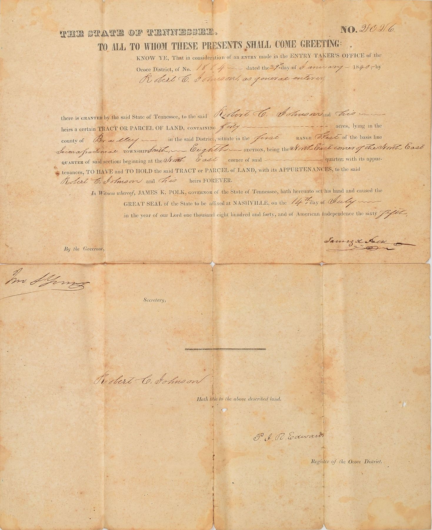 Partly-printed DS as governor of Tennessee, one page, 12.5 x 15.25, July 14, 1840. Governor Polk grants Robert C. Johnson "a certain Tract or Parcel of Land, containing forty acres, lying in the county of Bradley." Signed at the conclusion by Polk as governor, and countersigned by John S. Young as secretary of state, and F. J. R. Edwards as register of the Ocoee District. In very good condition, with scattered staining, small areas of paper loss along fragile intersecting folds, and complete separation across the central horizontal fold, held in place with a few small pieces of archival tape on the reverse; Polk's signature is clear and essentially unaffected by any flaws.