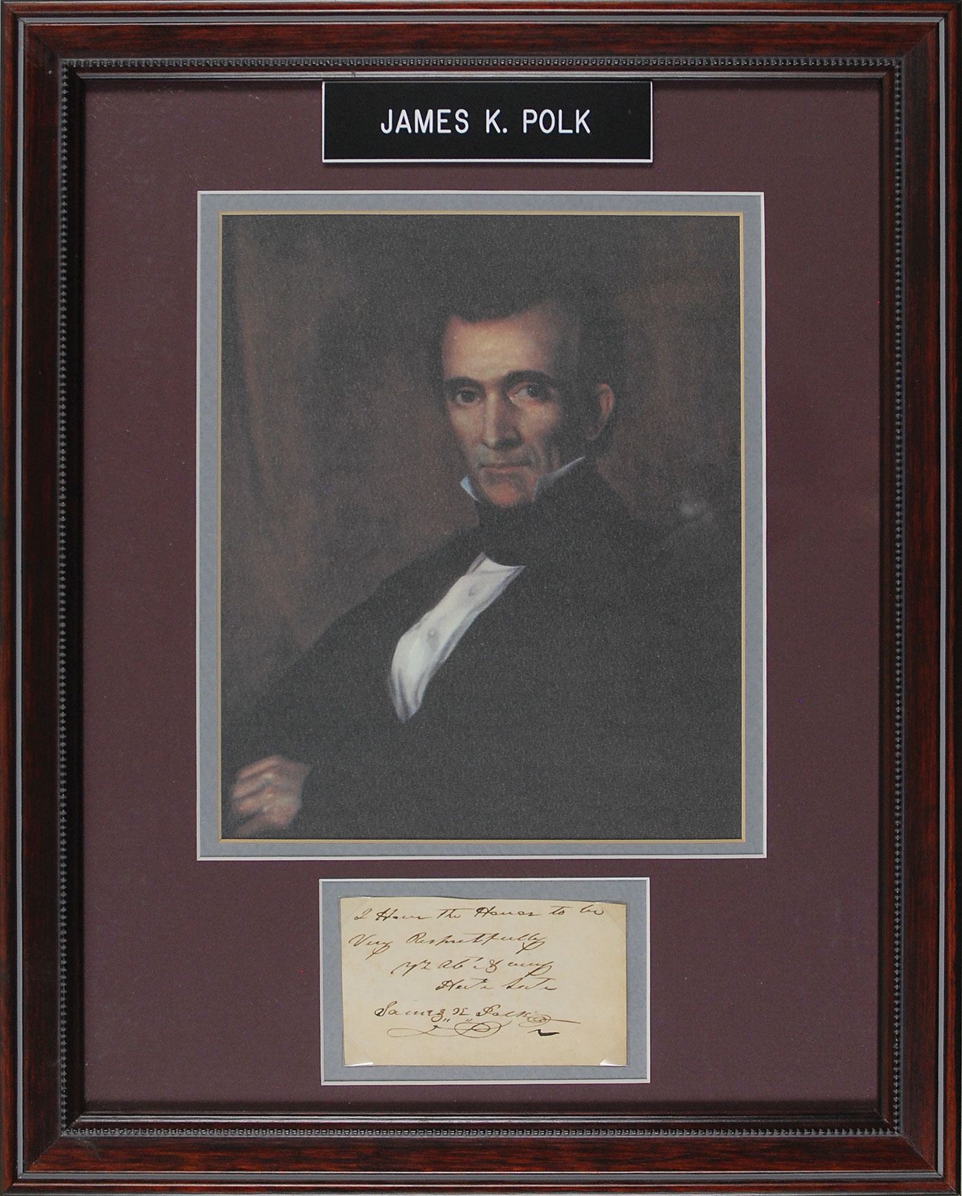 Elaborate ink signature, "I Have the Honor to be, Very Respectfully, yr obt & very Hmbl Servt, James K. Polk," clipped from the close of a letter. Double-matted and framed with a color portrait and nameplate affixed to the glass to an overall size of 11.5 x 14.5. In fine condition, with overall toning.