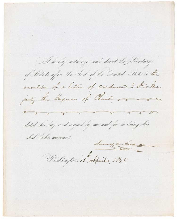 Partly-printed DS as president, one page, 8 x 10, April 15, 1845. President Polk orders the Secretary of State “to affix the Seal of the United States to the envelope of a letter of credence to His Majesty the Emperor of China.” Several horizontal folds, a diagonal crease through last letter of signature, and some mild edge toning, otherwise an attractive document in fine condition.