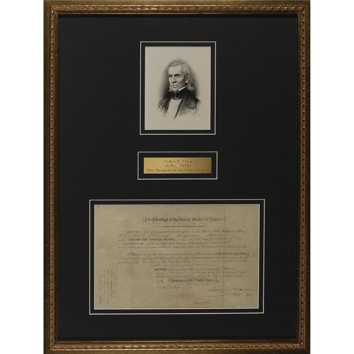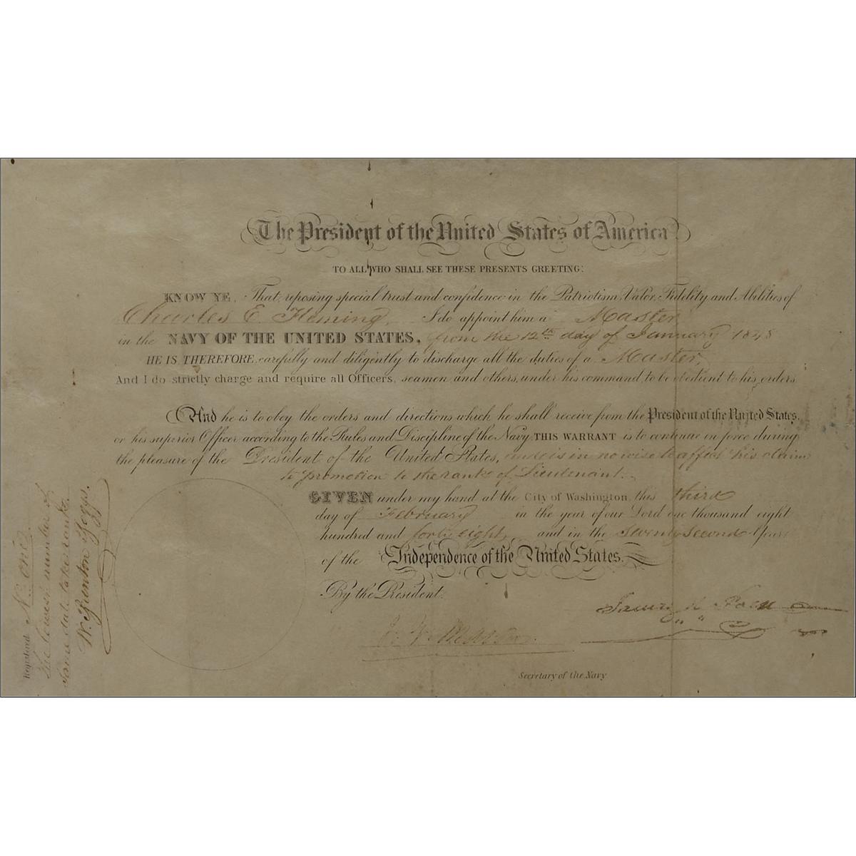 Partly-printed DS as president, one page, 10.25 x 6.75, February 3, 1848. President Polk appoints Charles E. Fleming “a Master in the Navy of the United States.” Signed at the conclusion by Polk, and countersigned by Secretary of the Navy John Mason. Archivally double matted and framed with a portrait of Polk and a small name plaque to an overall size of 16.75 x 22.5. In good condition, with three vertical folds, one through a single letter of signature, scattered toning and creasing, handwritten portions a few shades light, but still legible, skipping to Polk’s signature, and Mason’s signature very light, but still mostly legible. The seal is missing.