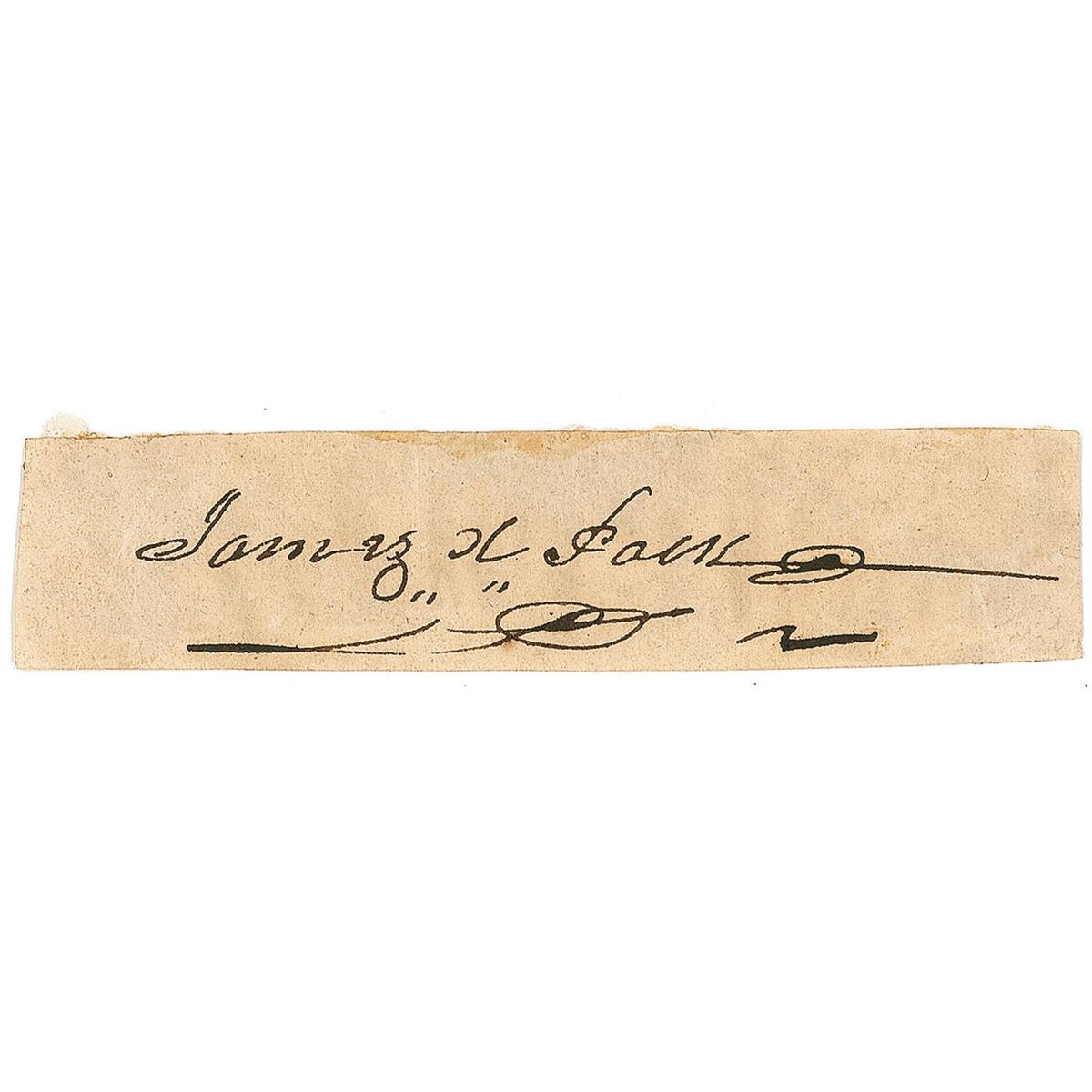 Bold ink signature, “James K. Polk,” on an off-white 3.5 x 1 clipped slip. In fine condition, with a uniform shade of light toning and mounting remnants to reverse.