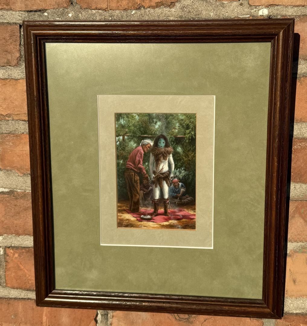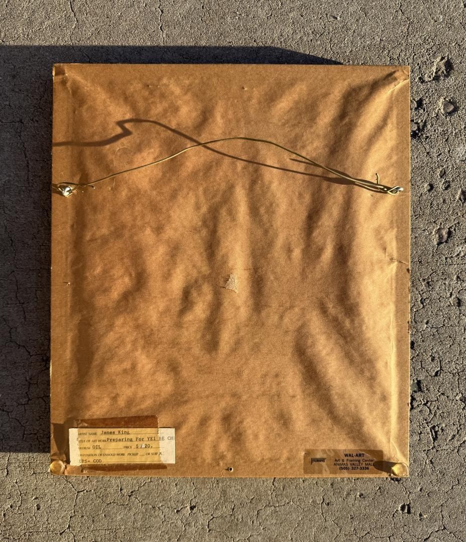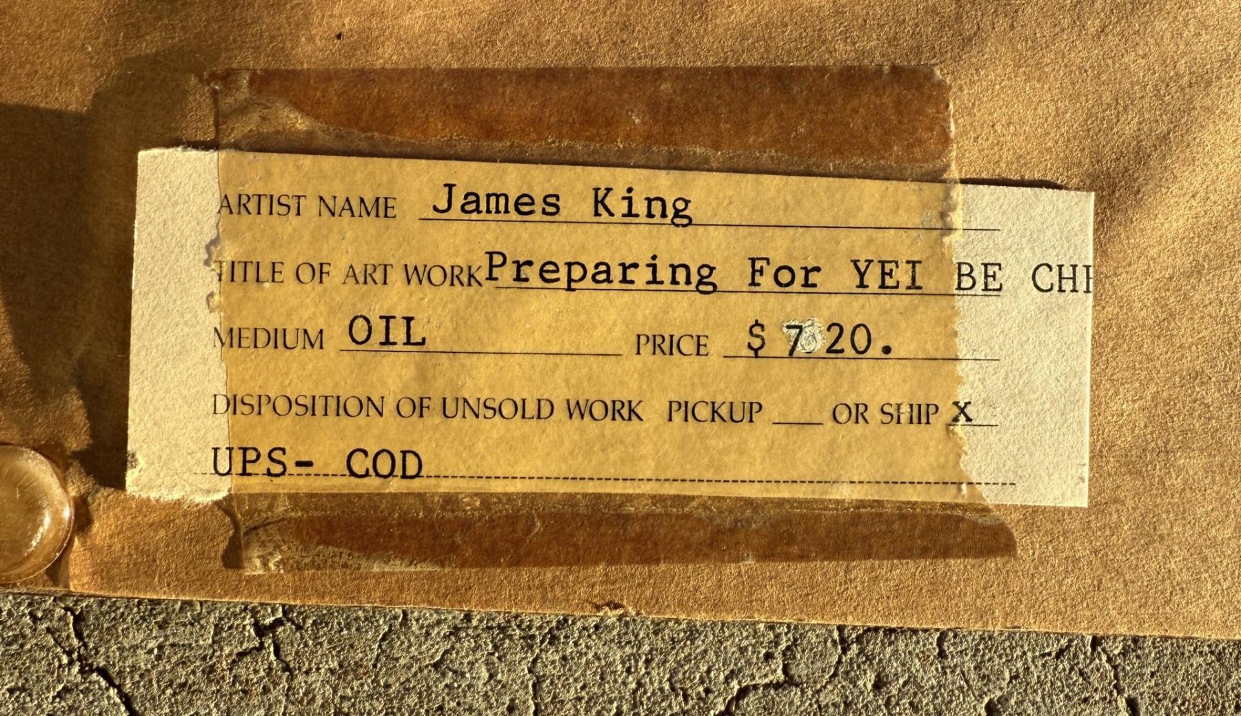 Title is Preparing for Ye Be Chei. Oil on Board. 12 1/2" by 14 1/4" framed. James B. King (Born 1951) was active/lived in New Mexico. James King is known for Figure, Native American genre paintings.
