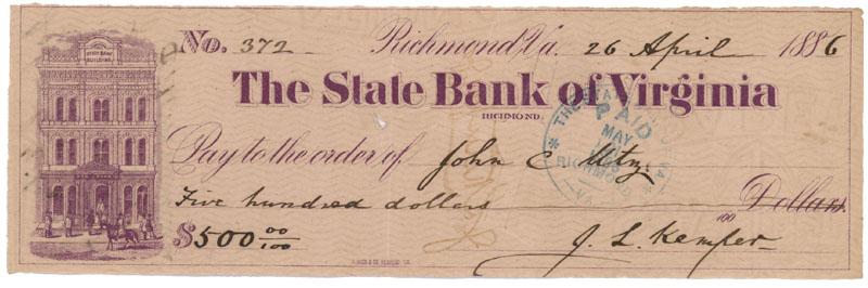 JAMES L. KEMPER (1823-1895) Lawyer, Confederate general in the Civil War and governor of Virginia. During the Civil War, Kemper saw action at, among other battles, First Bull Run, Seven Pines, Second Bull Run and Antietam. Partially Printed State Bank of Virginia Check for five hundred dollars Accomplished by and Signed, "J.L. Kemper." Richmond, Virginia. April 26, 1886. Vignette of bank at left edge. Stamp, punch and cut cancelled. Overall Extremely Fine.