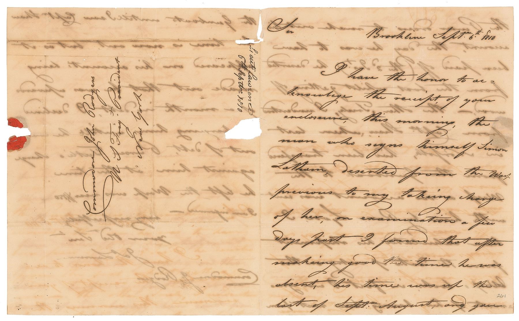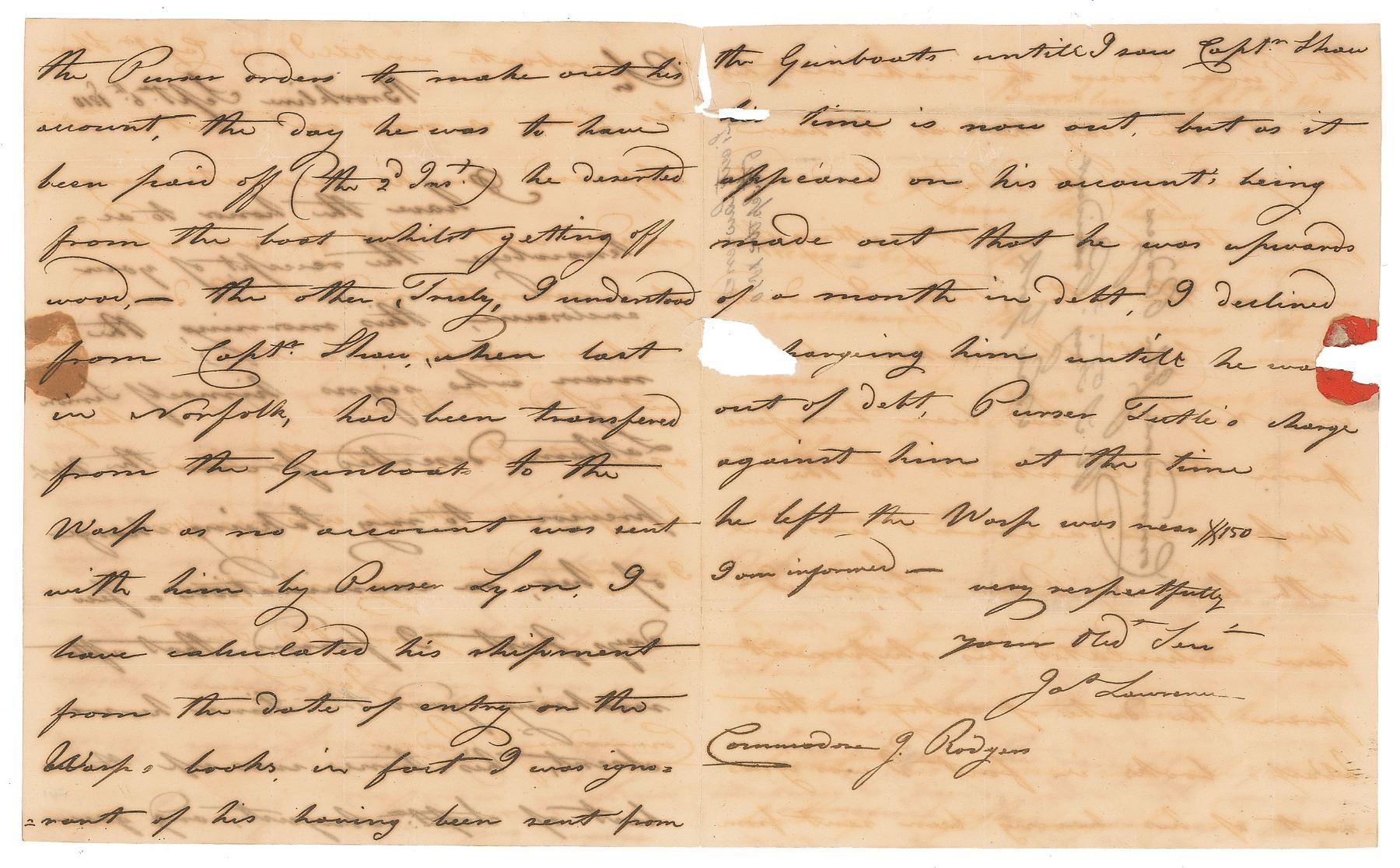 American naval officer who served as a commander of the USS Chesapeake during the War of 1812. He is perhaps best known for his dying command, 'Don't give up the ship!,' following an intense battle with the HMS Shannon off of Boston Harbor. ALS signed “Jas. Lawrence,” three pages on two adjoining sheets, 7.75 x 9.25, September 6, 1810. Written from "Brooklline," a letter to Commodore John Rodgers of the USS President, in full: "I have the honor to acknowledge the receipt of your enclosure, this morning, the man who signs himself Simon Latham, deserted from the Wasp previous to my taking charge of her, on examination a few days past I found that after making good the time he was absent, his time was up the last of August, and gave the Purser orders to make out his amount, the day he was to have been paid off (the 2d Inst.) he deserted from the boat whilst getting off wood,—the other, Truly, I understood from Captn Shaw, when last in Norfolk, had been transferred from the Gunboat to the Wasp as no amount was sent with him by Purser Lyon. I have calculated his shipment from the date of entry on the Wasp's books, in fact I was ignorant of his having been sent from the Gunboats untill I saw Captn Shaw his time is now out, but as it appeared on his account; being made out that he was upwards of a month in debt, I declined charging him untill he was out of debt, Purser Tuttle's charge against him at the time he left the Wasp was near $150—I am informed." In very good to fine condition, with partial splitting to the hinge, two edge tears, ink erosion affecting one word of text, and seal-related paper loss to the integral address leaf.
